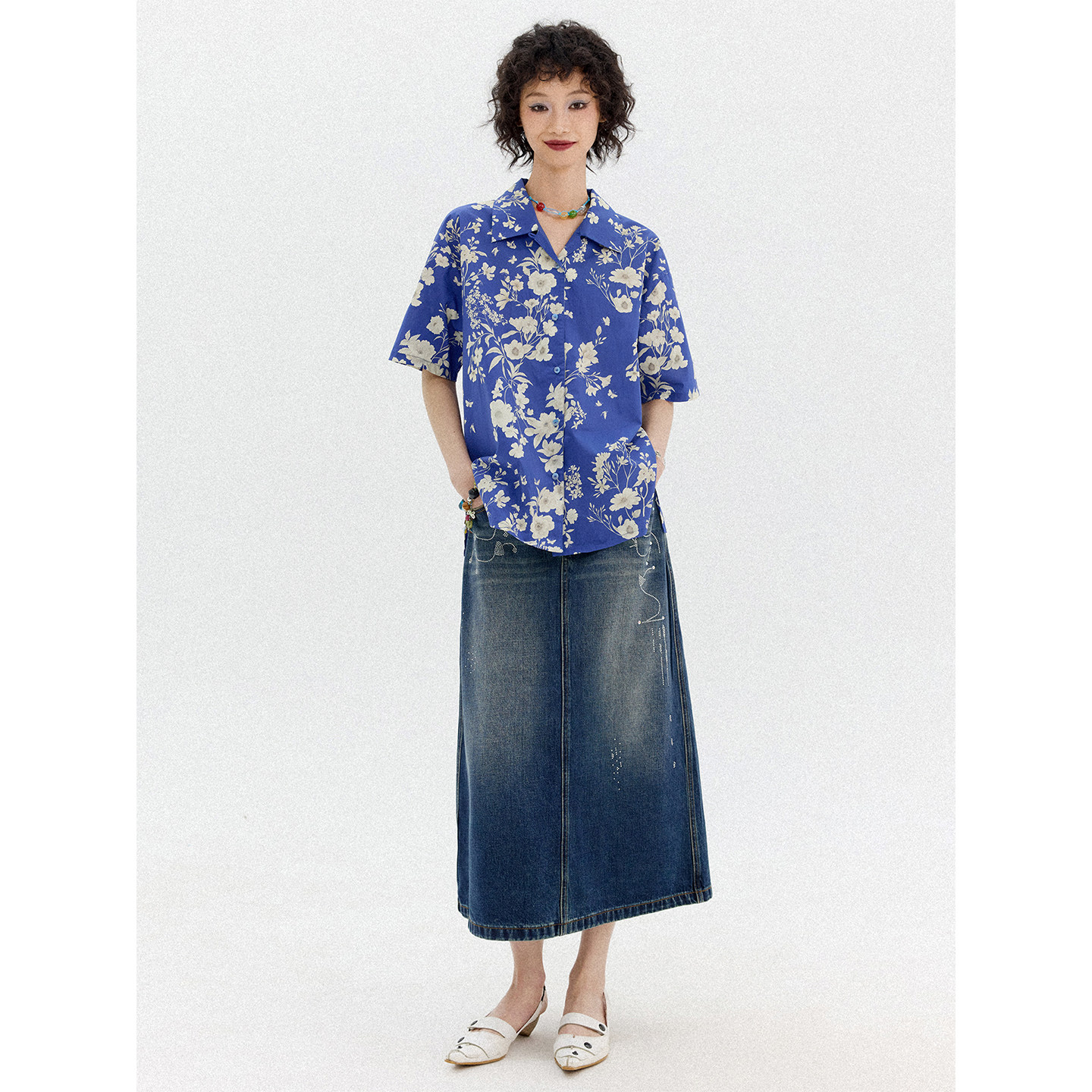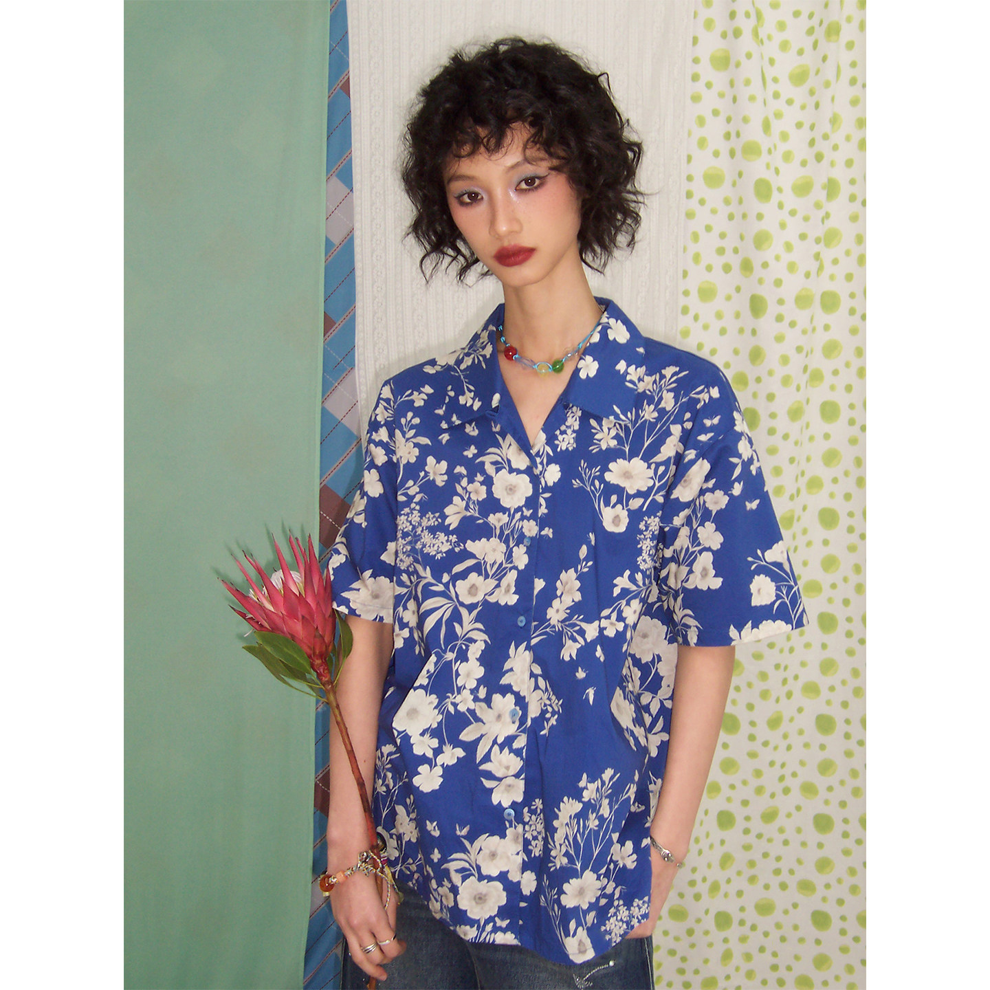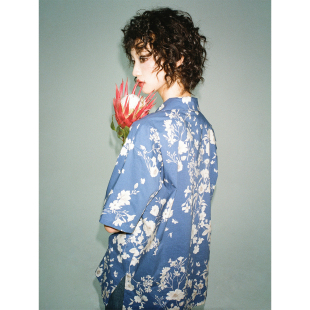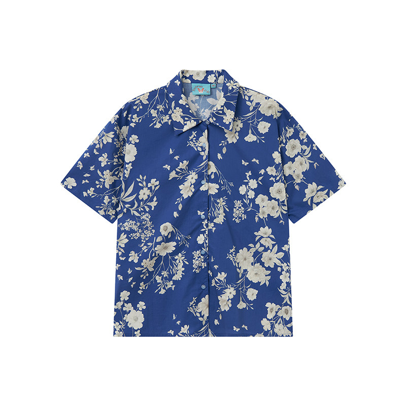女宽松上衣夏新品 化学少女「青霜」纯棉印花蓝色短袖 T恤衬衫