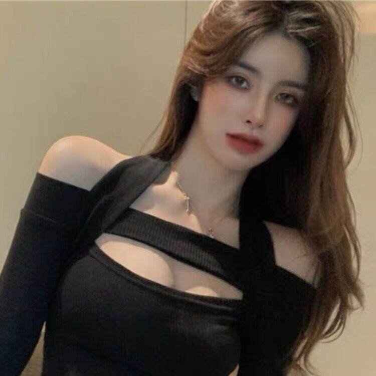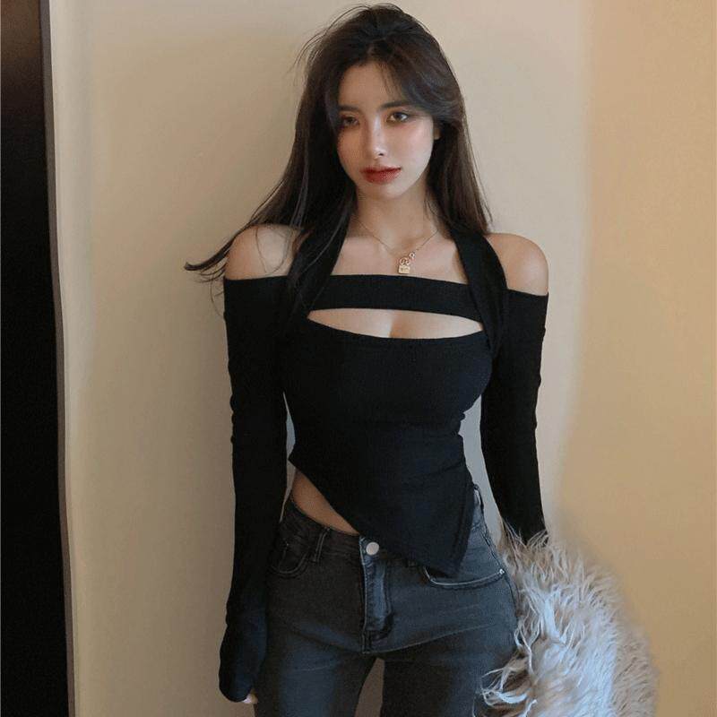 韩国气质性感紧身挂脖辣妹t恤女士春秋不规则露肩显胸大显瘦上衣