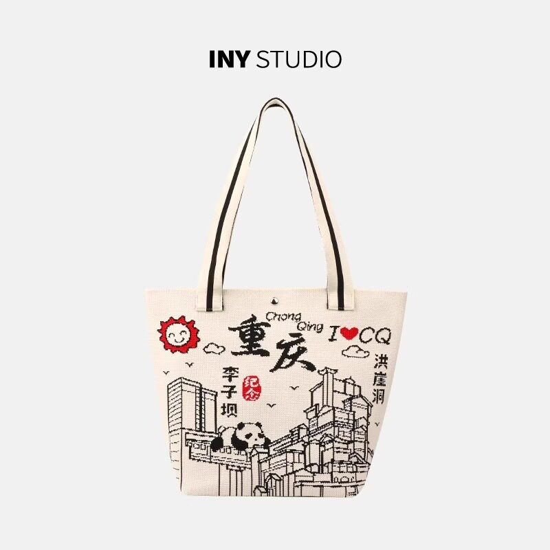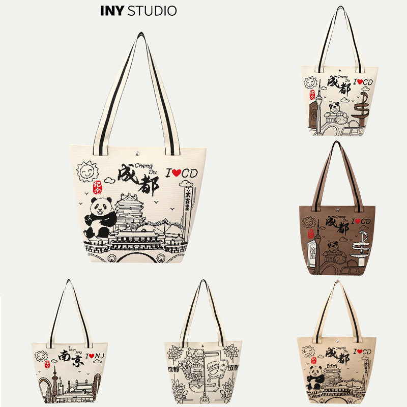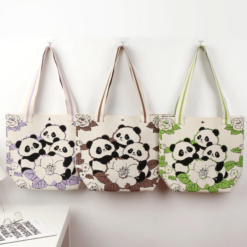 新款 熊猫针织包女单肩中国风大容量磁扣针织袋手提购物袋双面印花