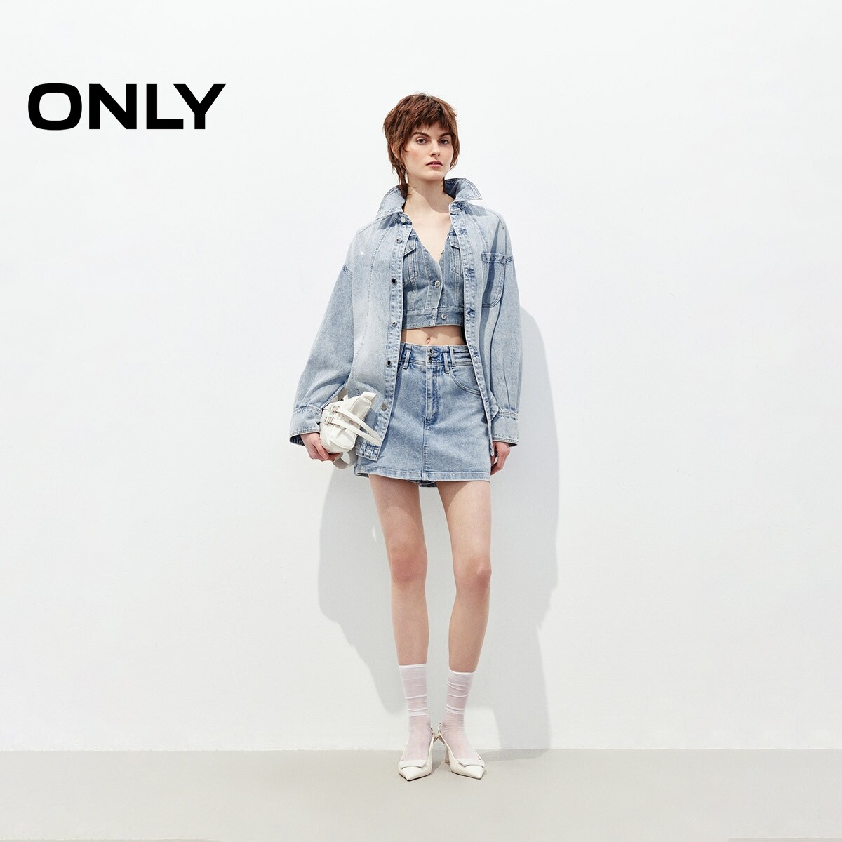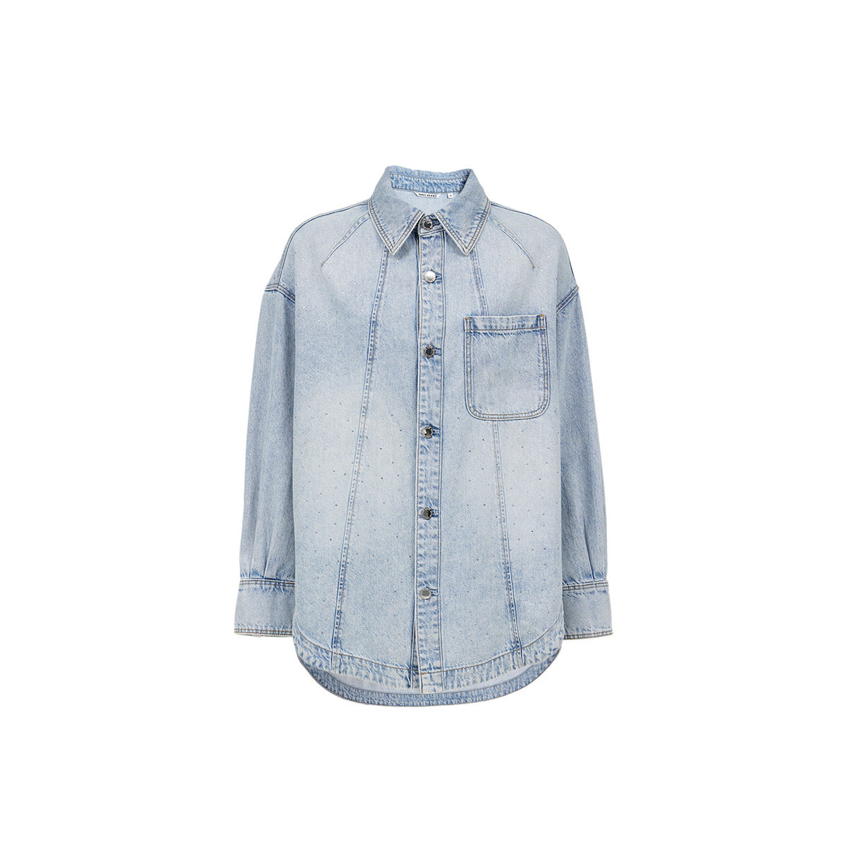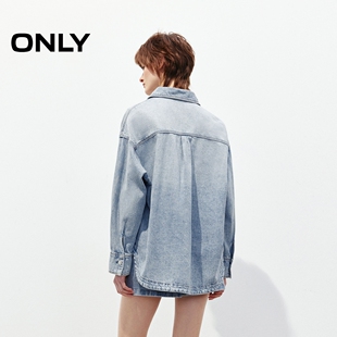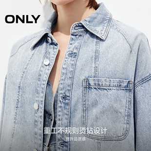 绫致ONLY夏重工烫钻实用贴布口袋宽松显瘦落肩牛仔衬衫 女