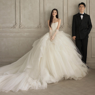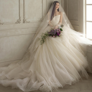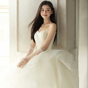 法式 简约显瘦公主蓬蓬裙森系旅拍出门纱仙 缎面婚纱一字肩2025新款