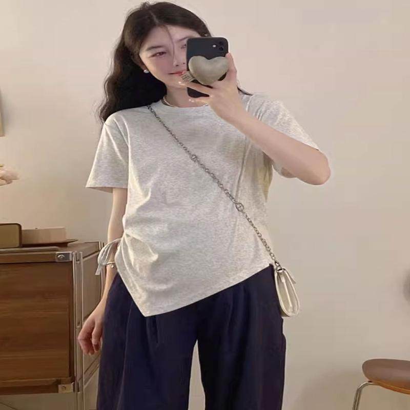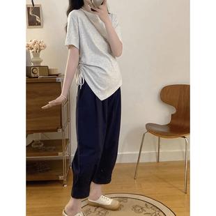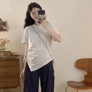 宽松弹力抽绳不规则设计休闲T恤减龄短袖 孕妇装 上衣 2025新款 夏季