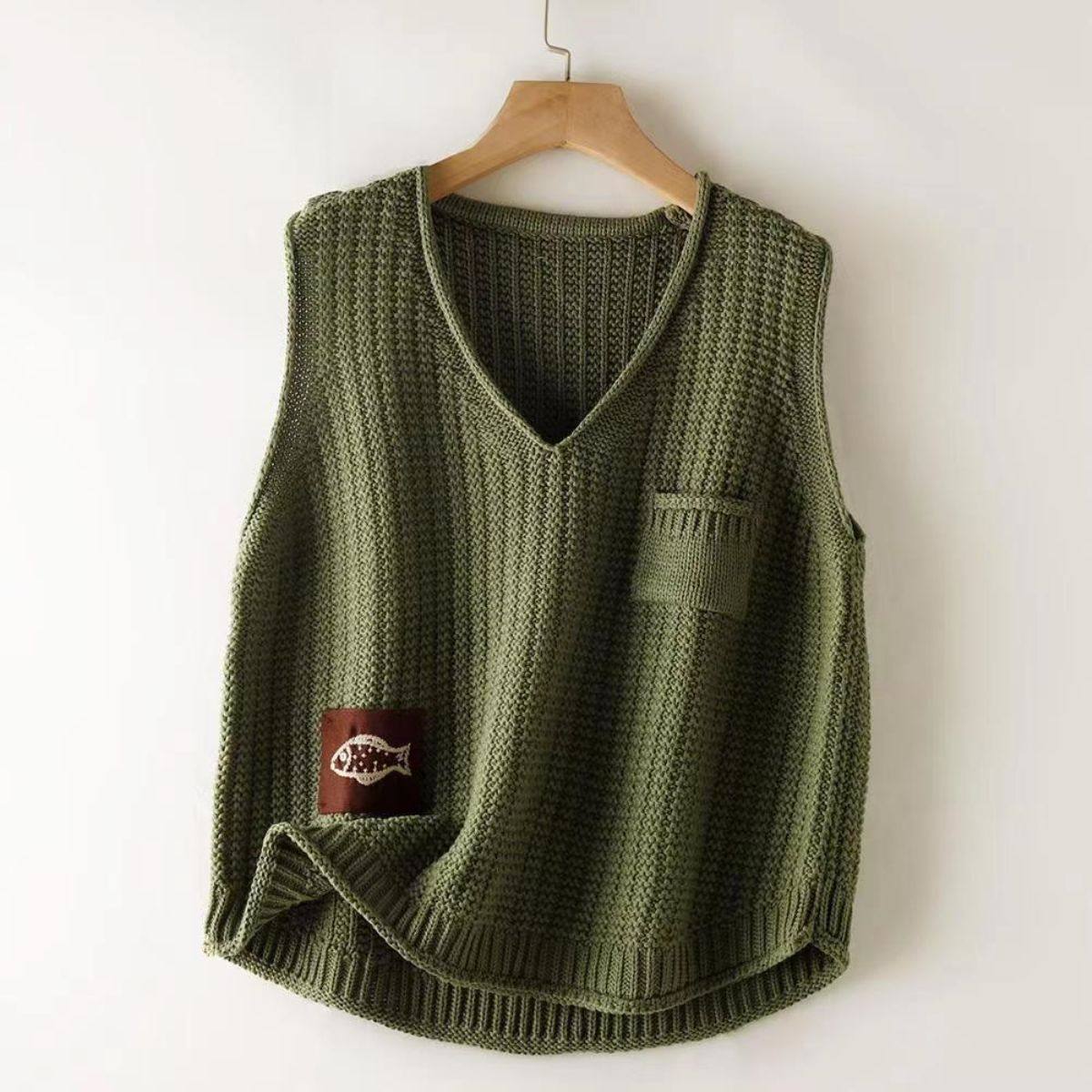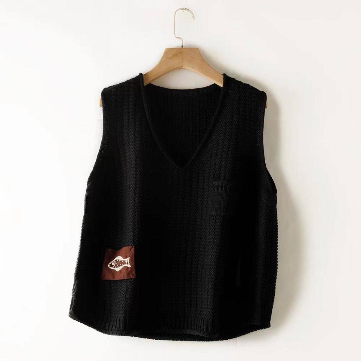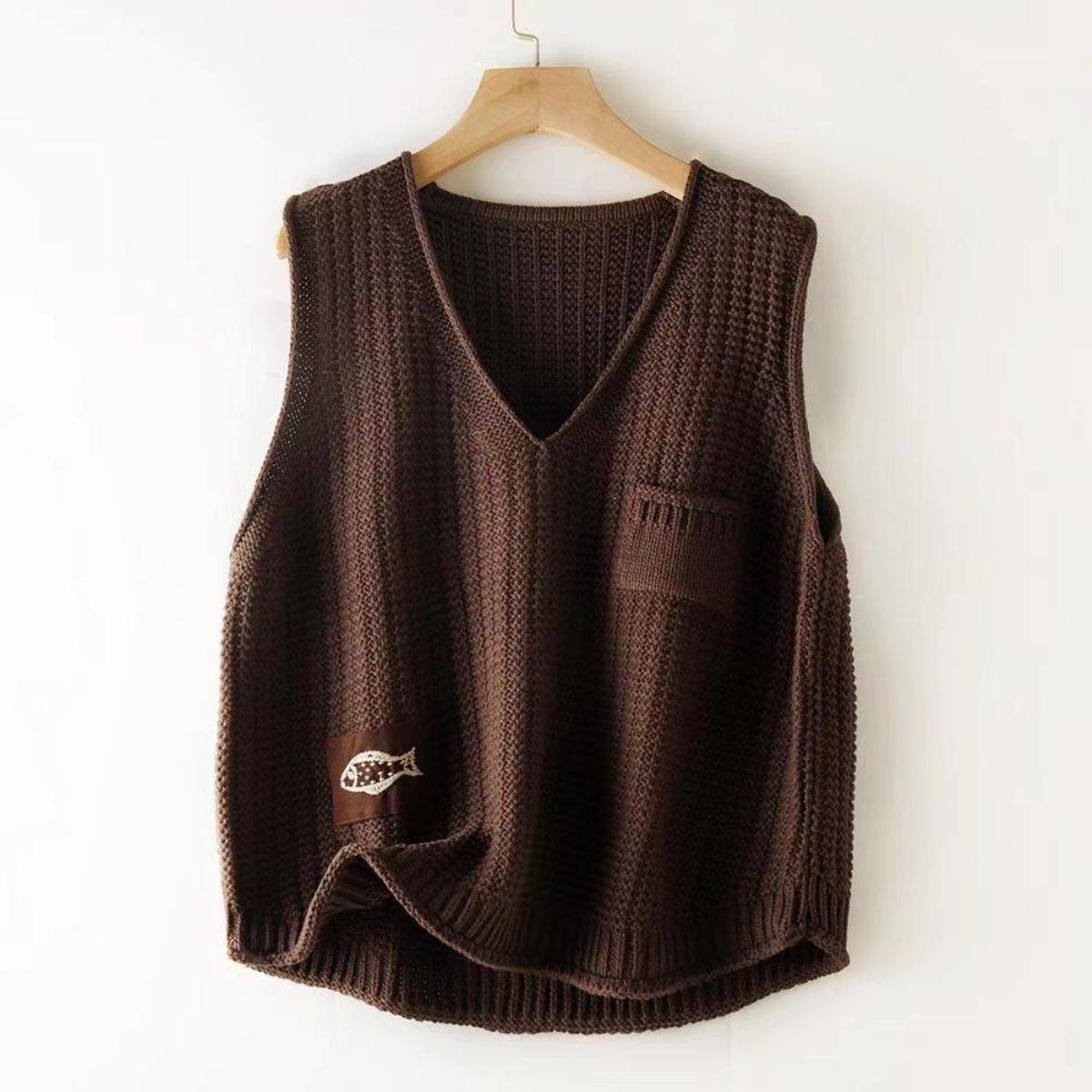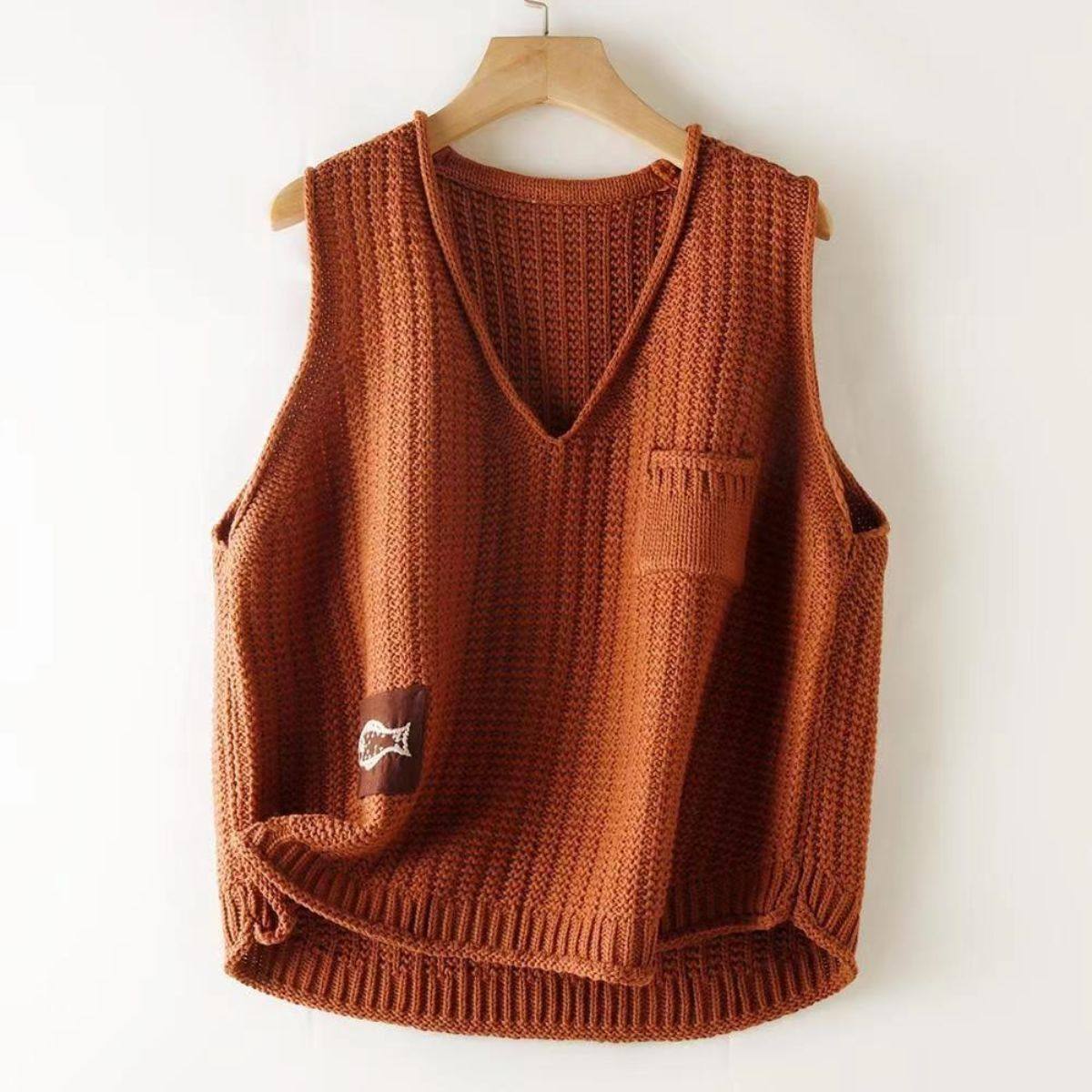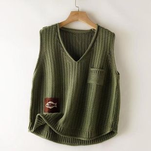 宽松休闲套头马夹 大码 复古贴标V领马甲针织背心女2025年春季 新款