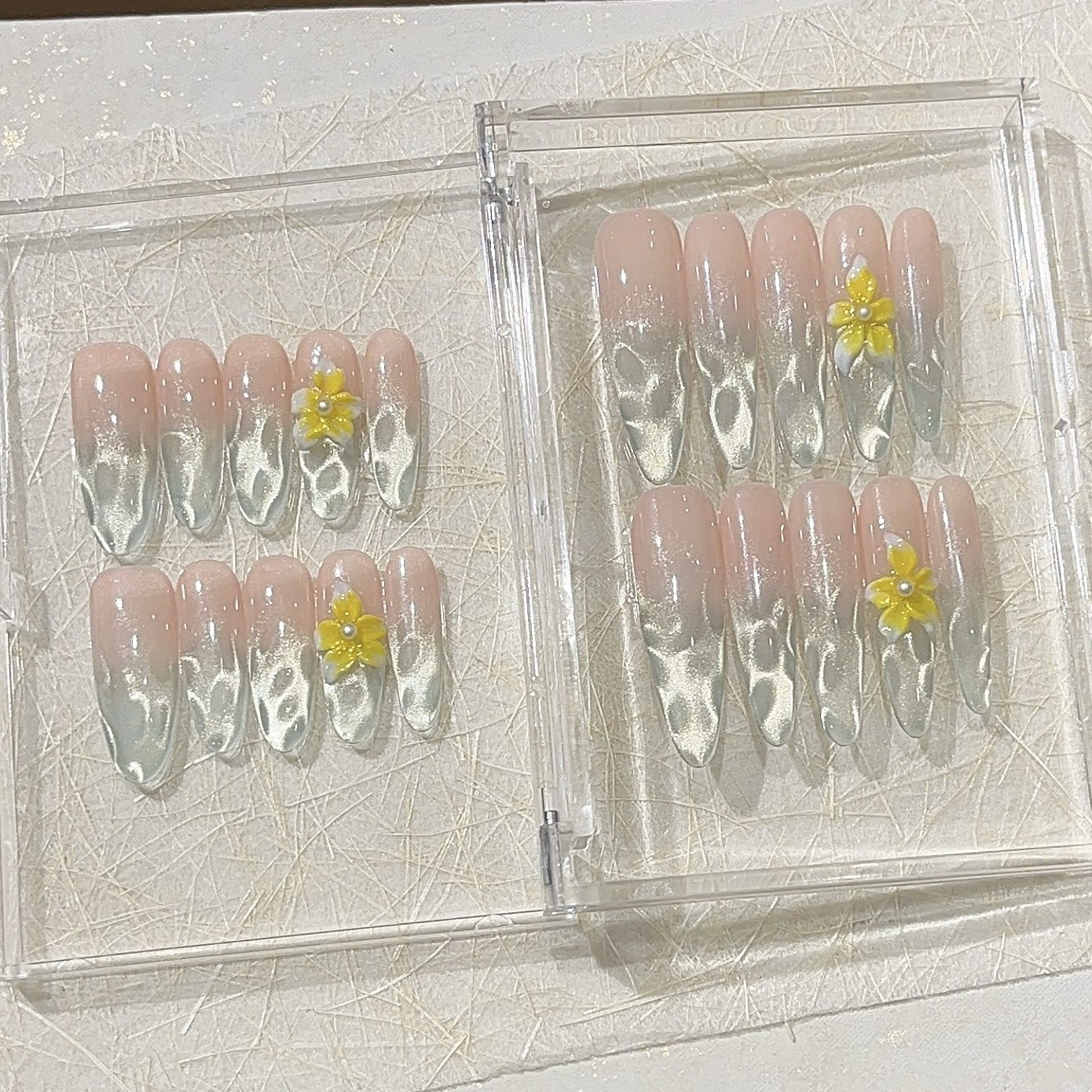 海边度假 薄荷绿海波纹鸡蛋花猫眼纯手工穿戴甲美甲贴 柠檬海盐