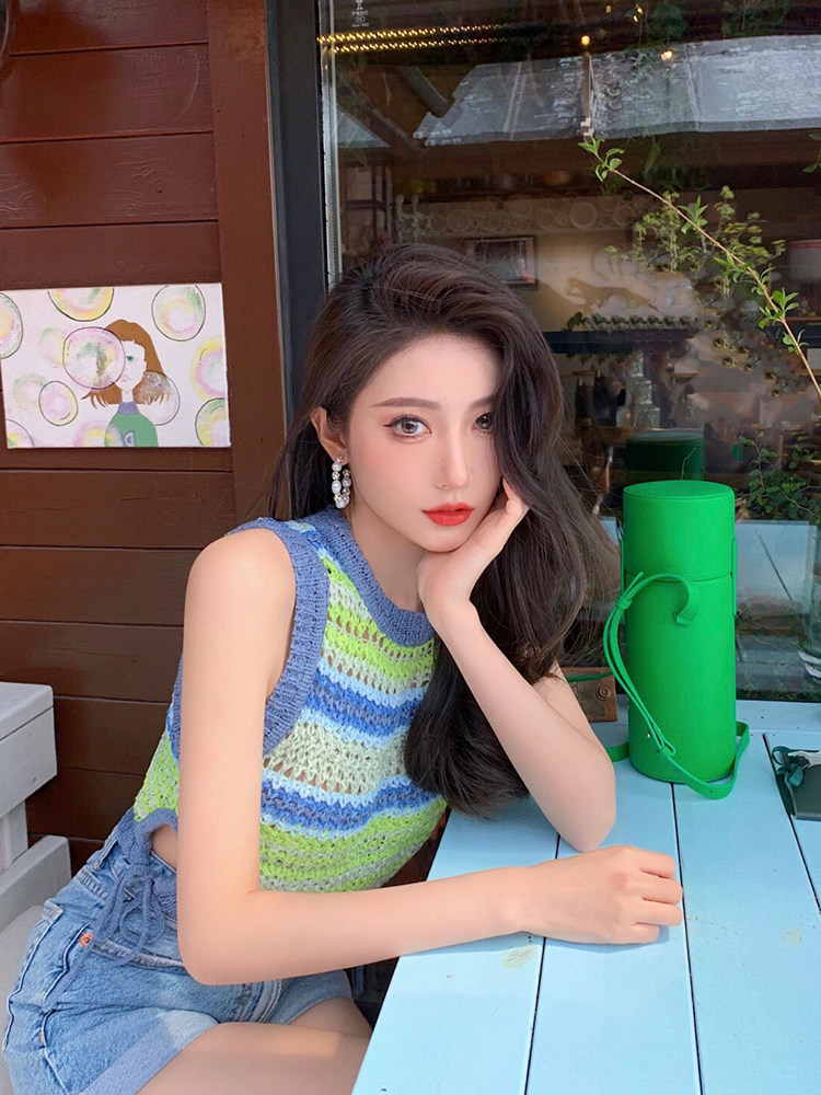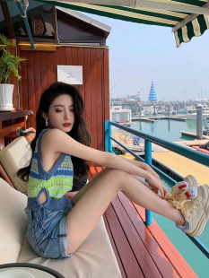 设计感独特镂空秋季 小众条纹撞色多巴胺穿搭吊带背心上衣夏海边
