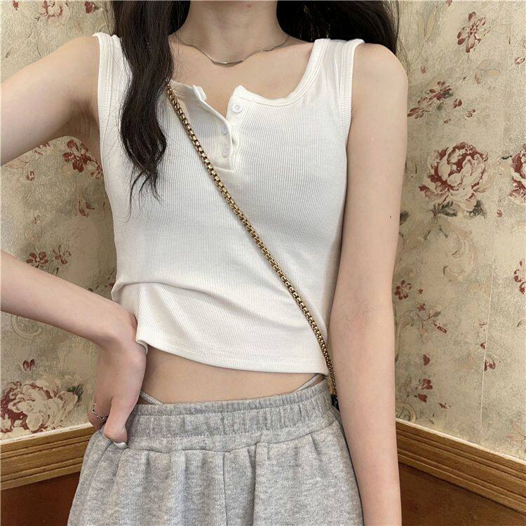 chic百搭基础款 T恤螺纹棉上衣 纽扣吊带背心女2026夏复古外穿无袖