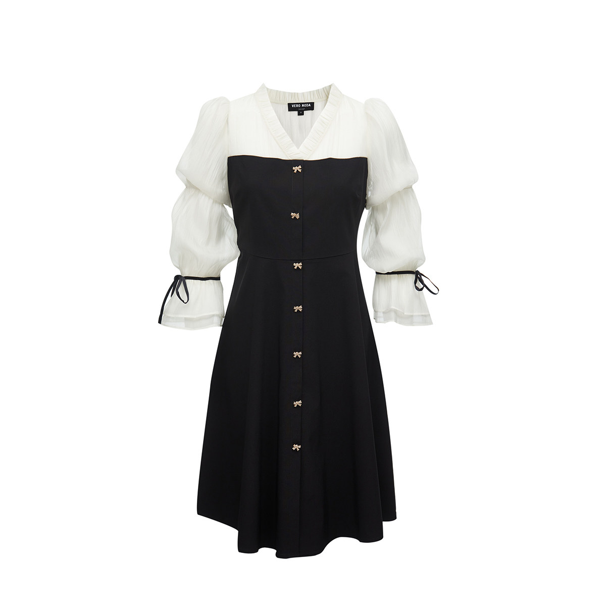 tq区绫致VeroModa连衣裙春夏公主风V领雪纺泡泡袖 拼接