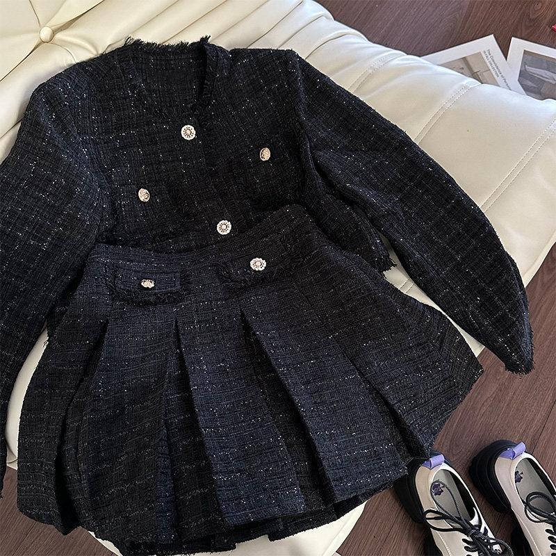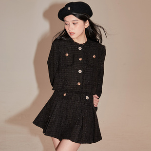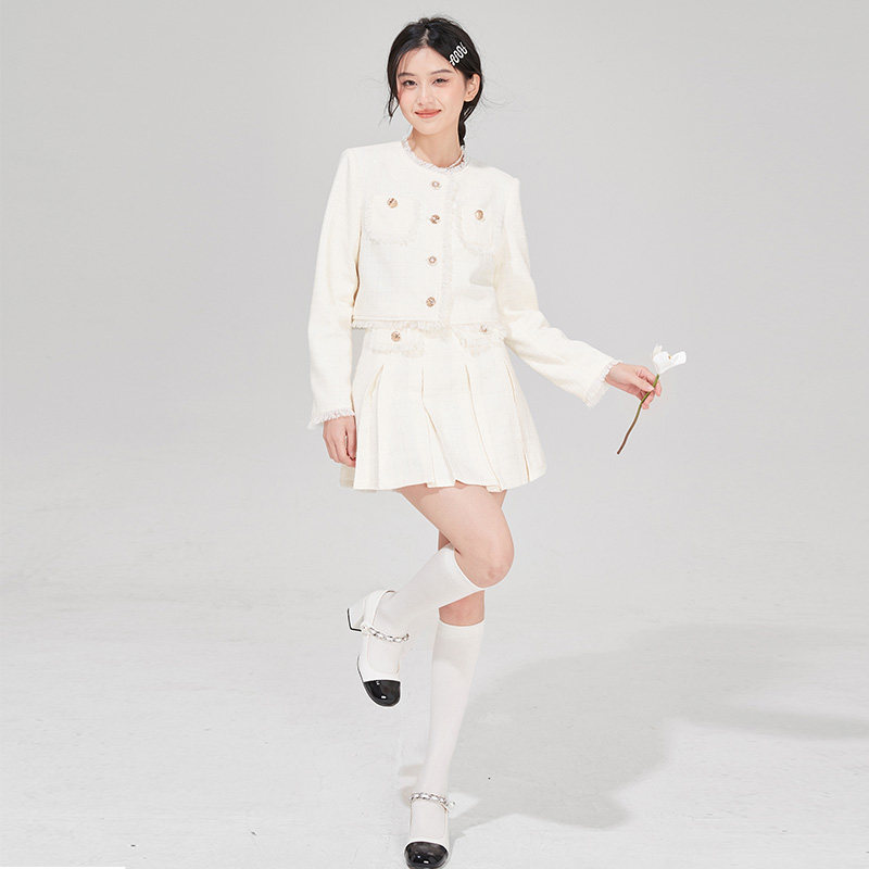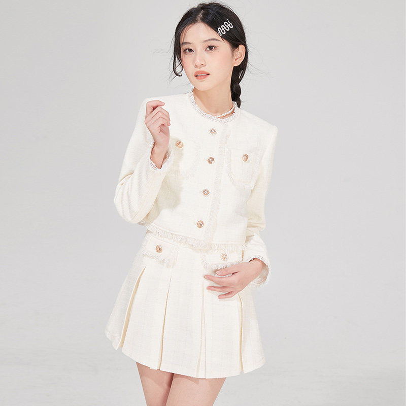 新款 黑白两色毛边春季 上衣女 流苏粗纹小香风外套裙子套装 NANGOON