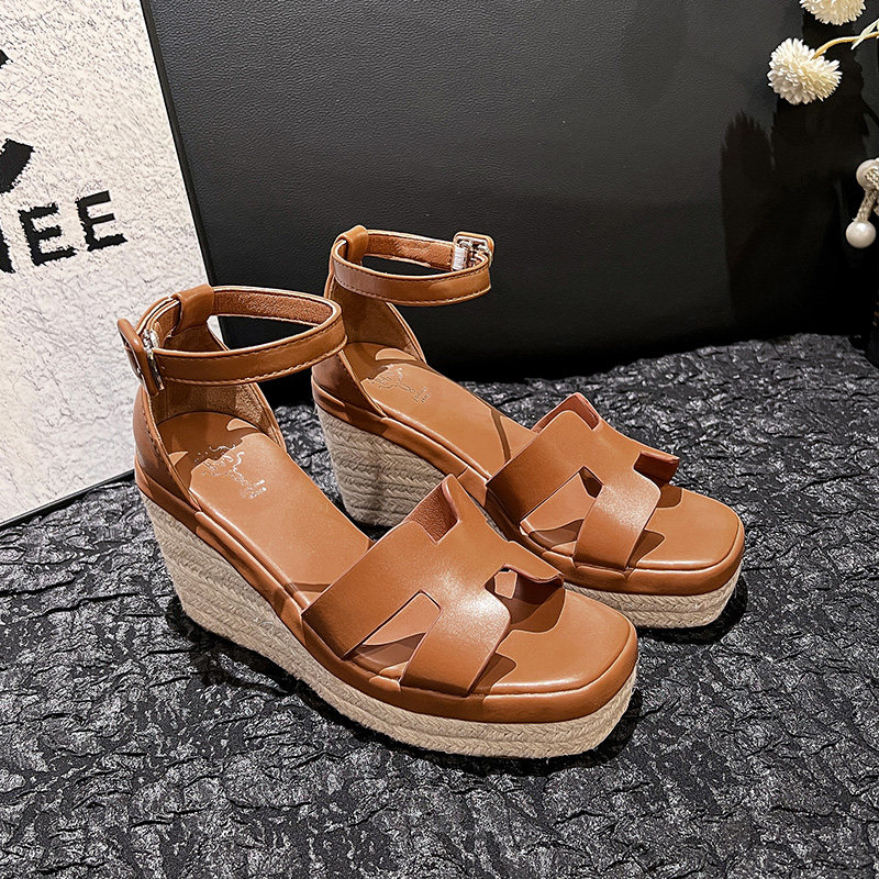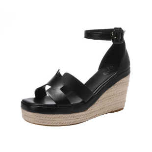 露趾草编厚底防水台一字扣带超高跟鞋 新款 10cm 女夏季 百搭坡跟凉鞋