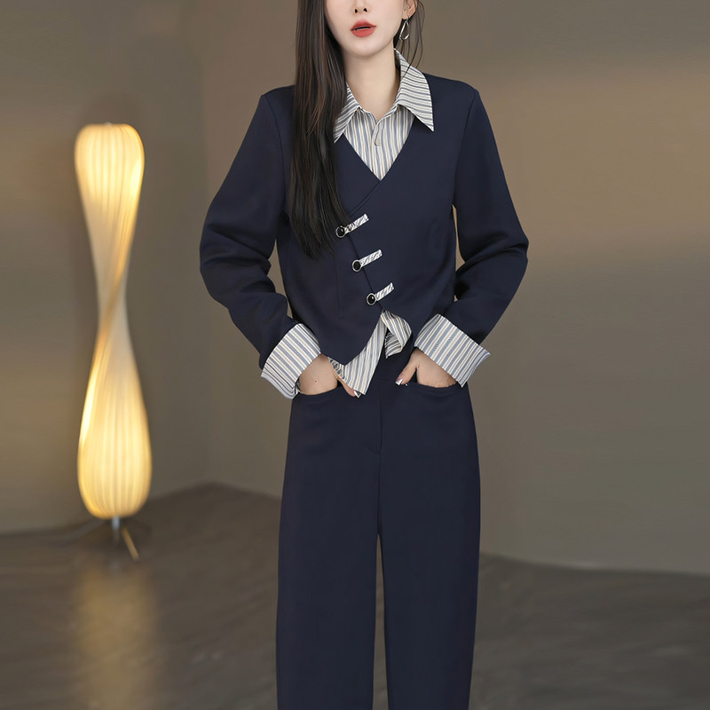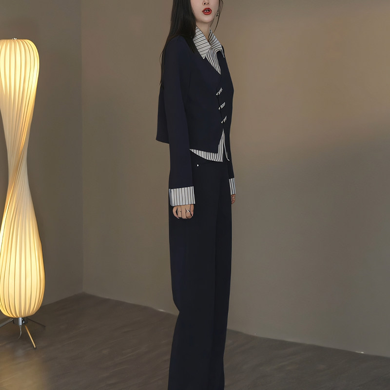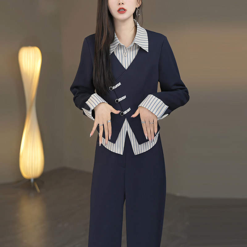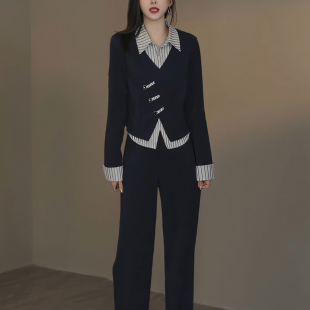 套装 2024秋季 长裤 假两件上衣 女气质韩系洋气通勤拼接两件套 新款