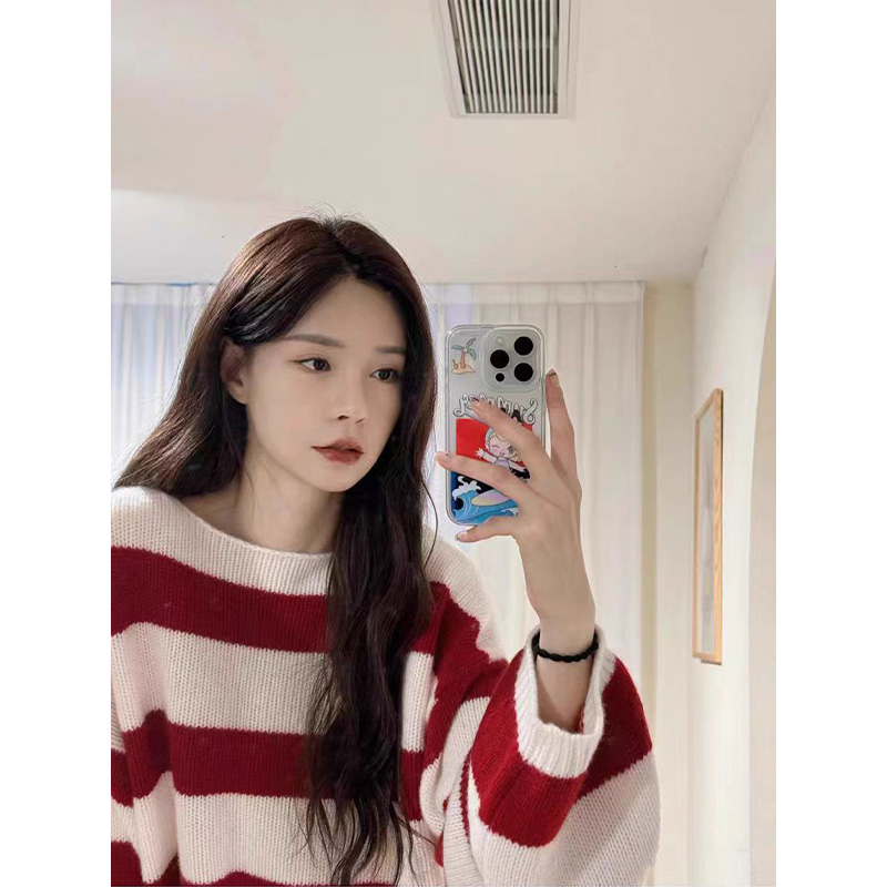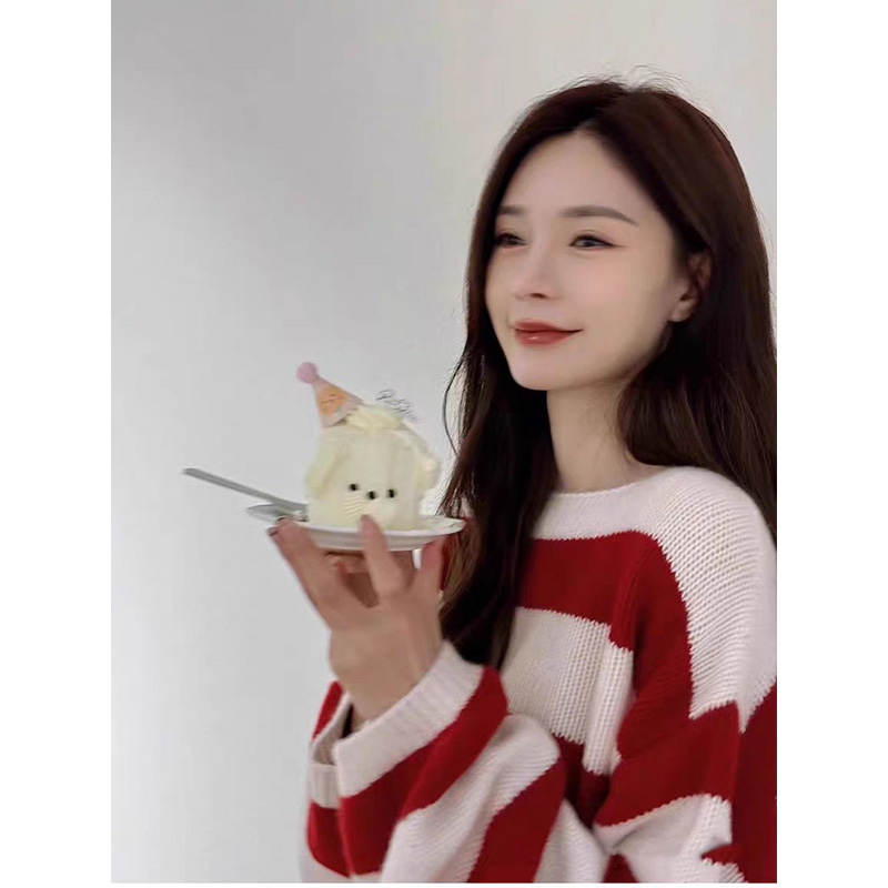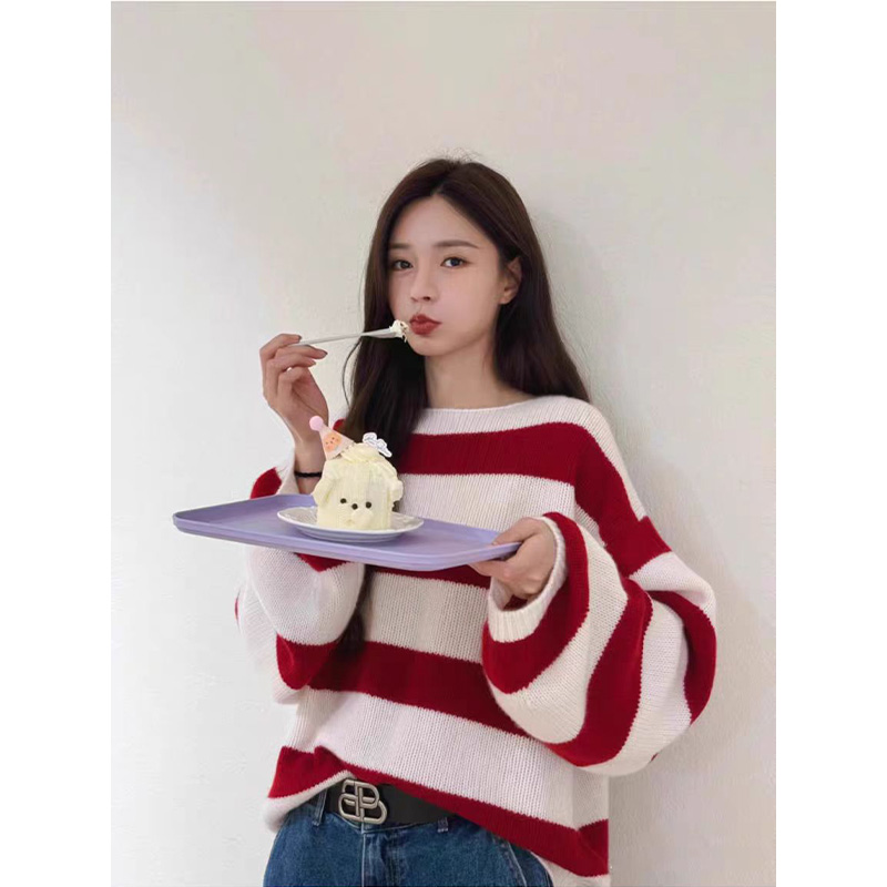 慵懒针织衫 沈梦辰同款 红白条纹毛衣女秋冬季 韩版 上衣 100%羊毛