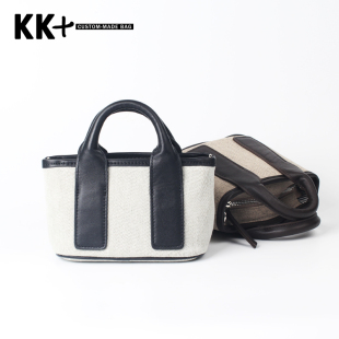 头层牛皮拼亚麻mini花园包手提包单肩斜挎简约托特包购物袋熊猫色