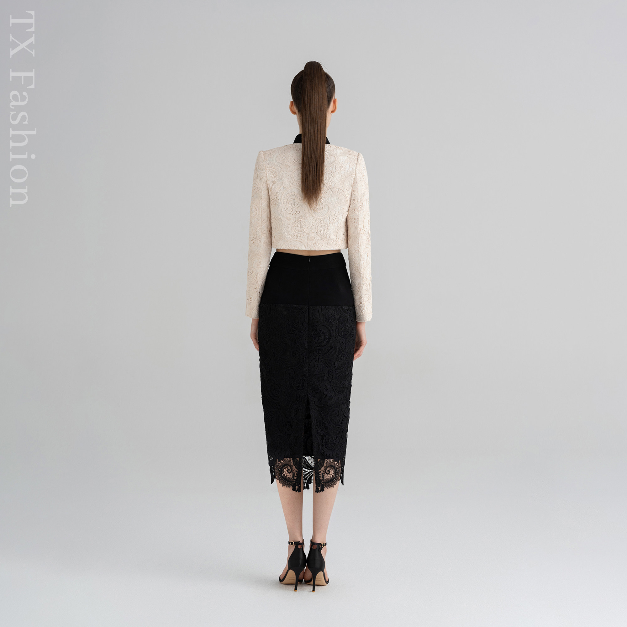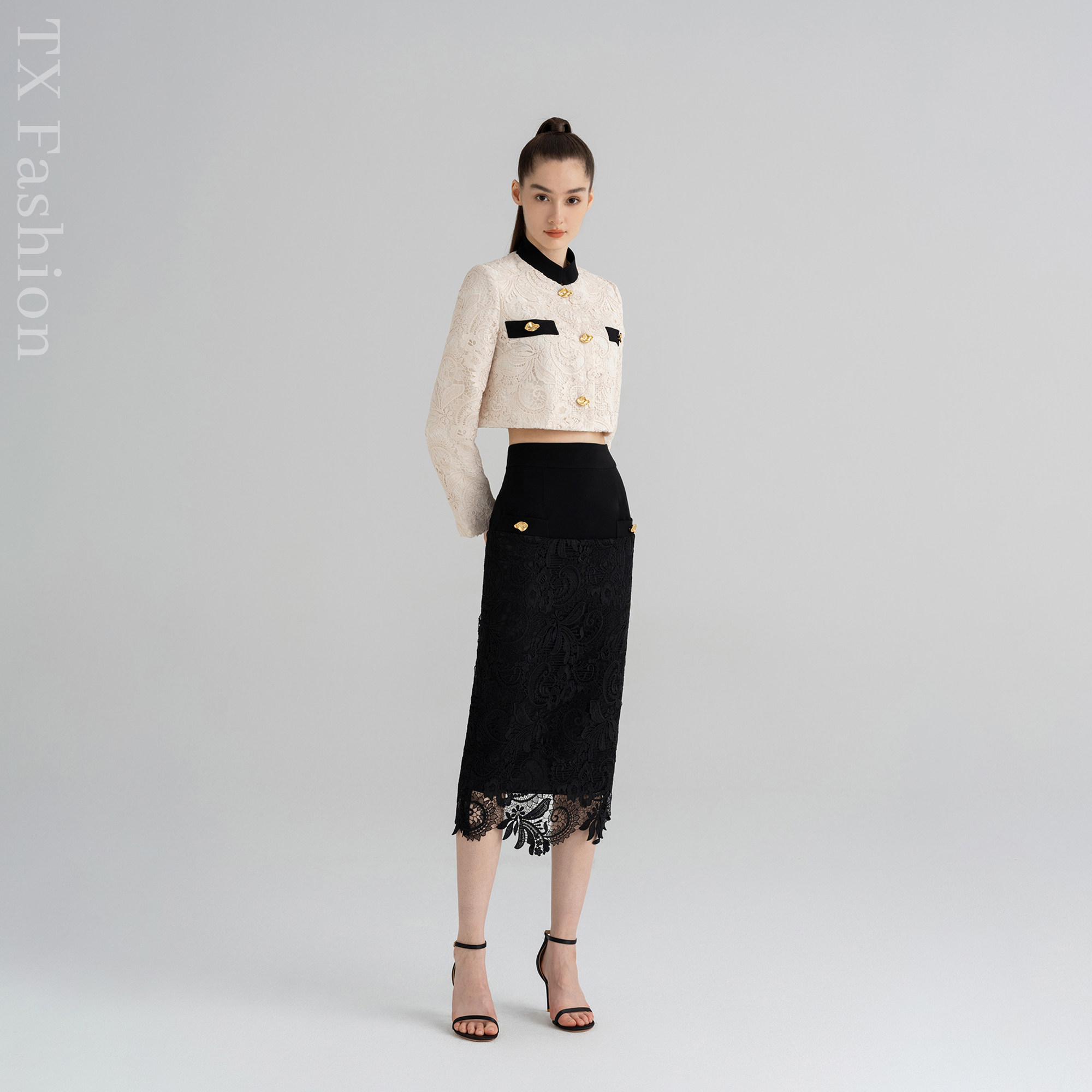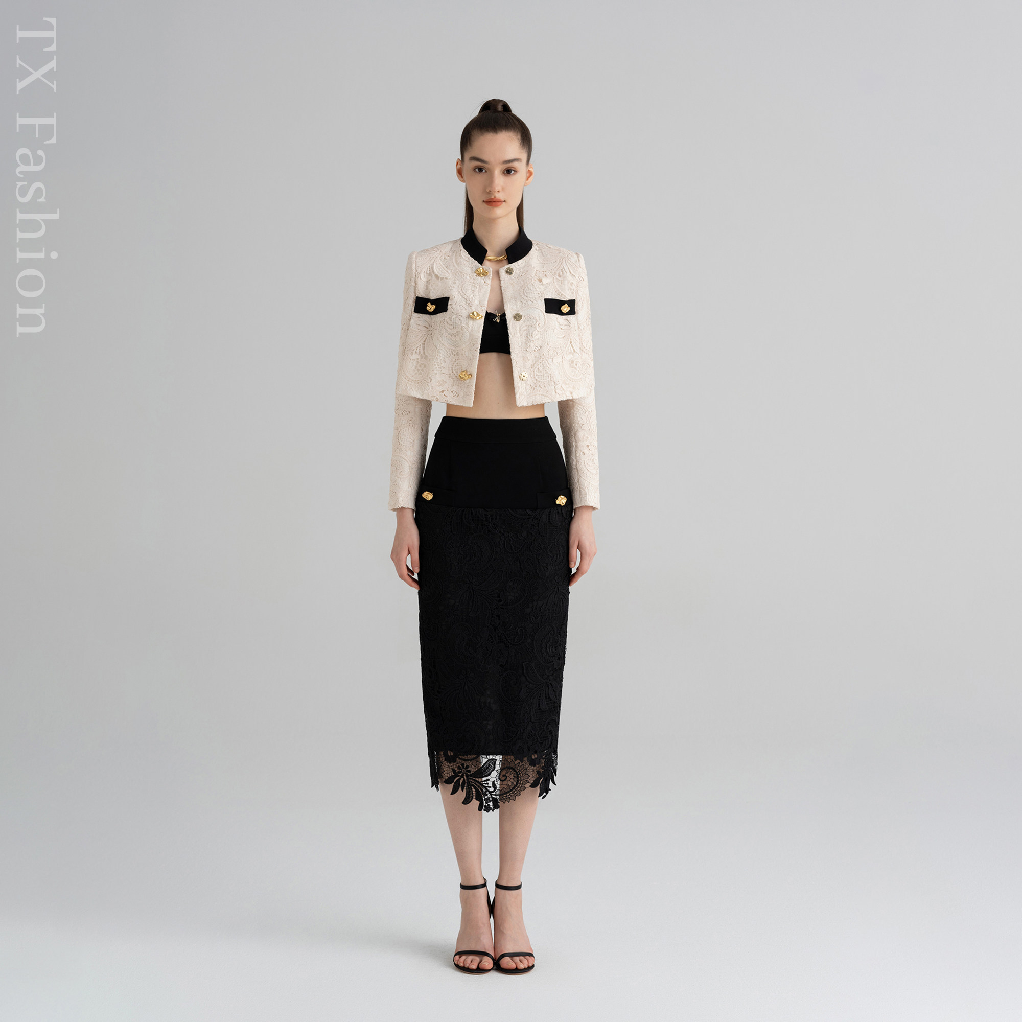 小香风进口水溶蕾丝皇室立领外套黑色蕾丝包臀长半裙 YOLLA