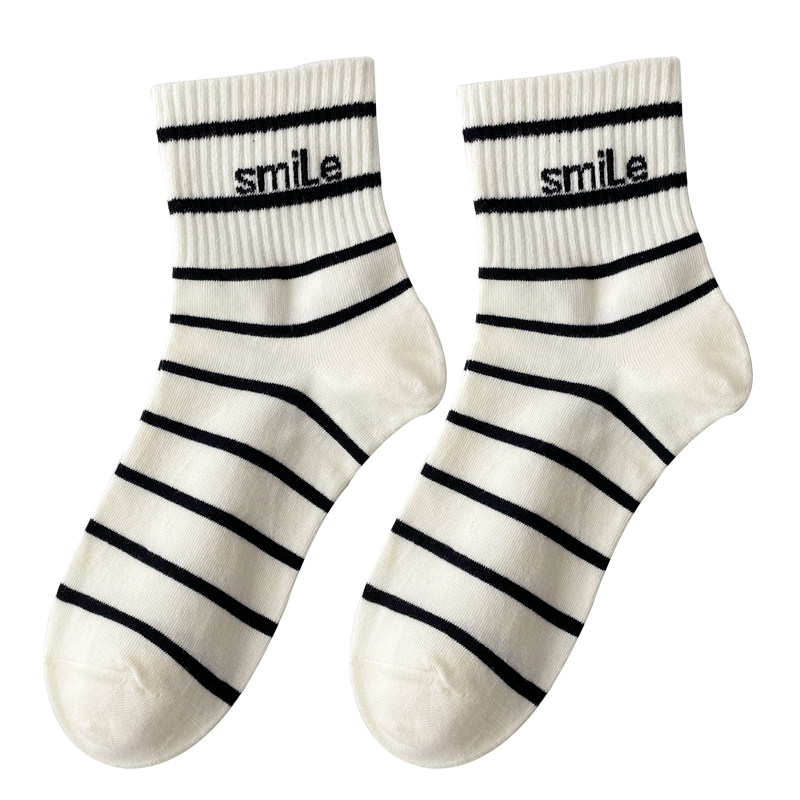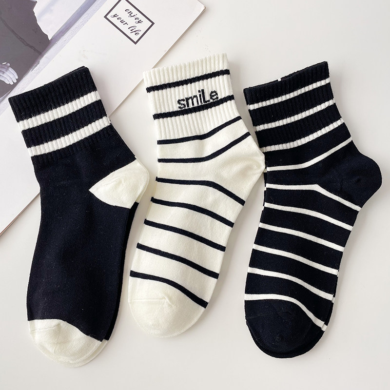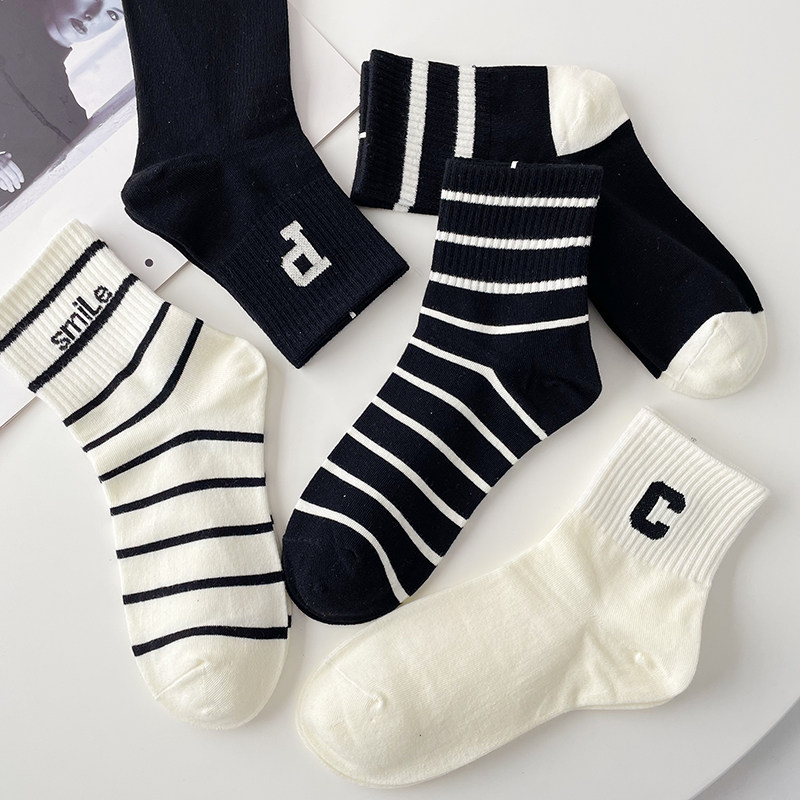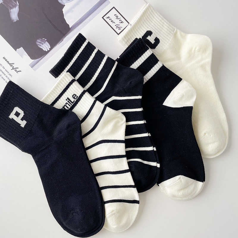 条纹袜子女秋季 黑白长袜百搭 中筒袜ins潮棉袜cp字母运动袜春秋款