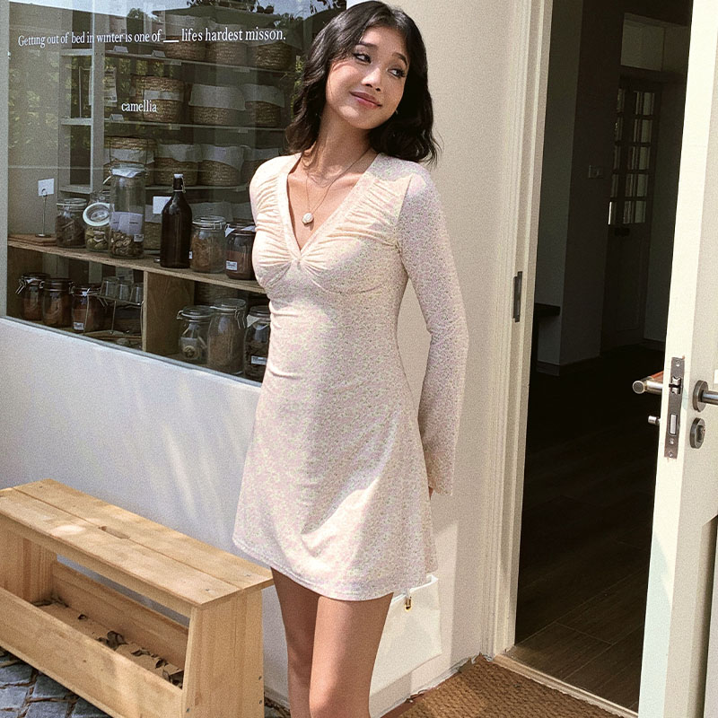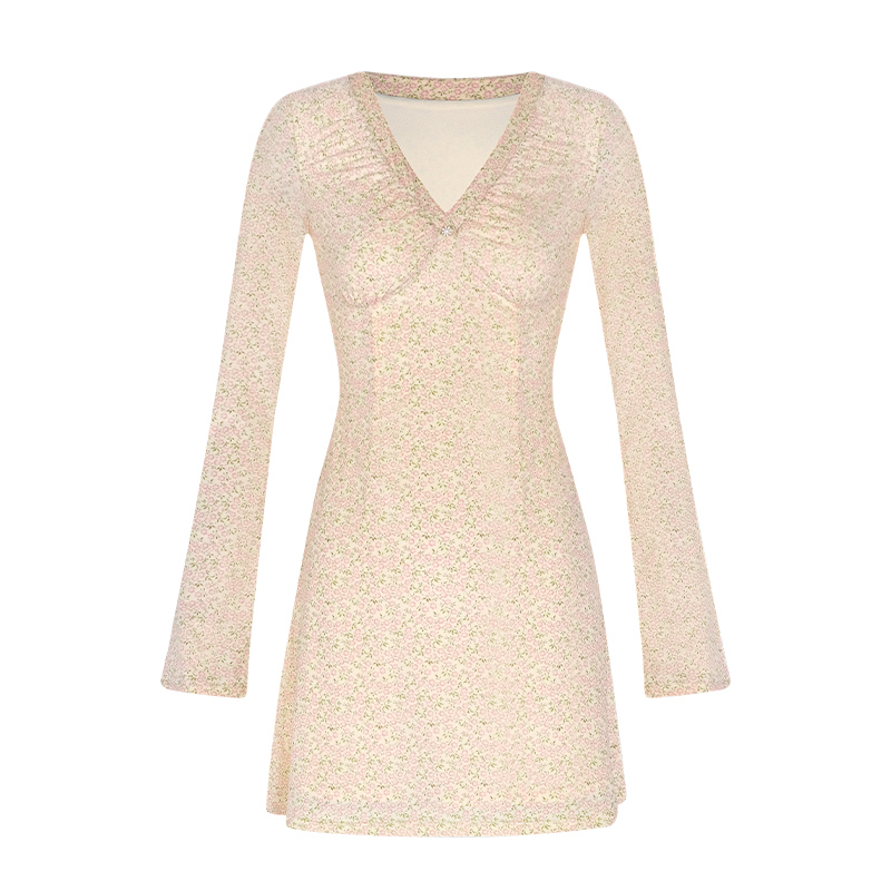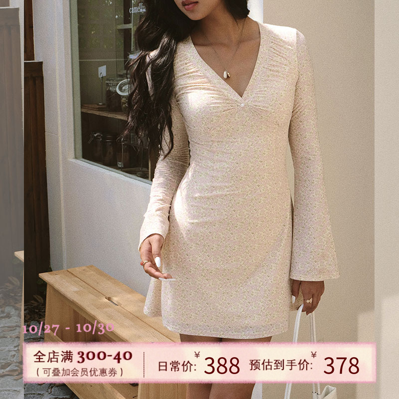 设计短裙复古性感包臀裙子 V领碎花连衣裙女秋喇叭袖 ITSNIKAR 法式