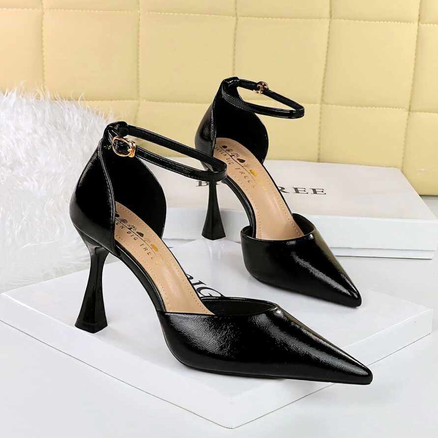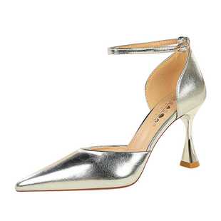 41中空包头凉鞋 欧美风亮面银色一字带高跟鞋 女酒杯跟细跟尖头大码