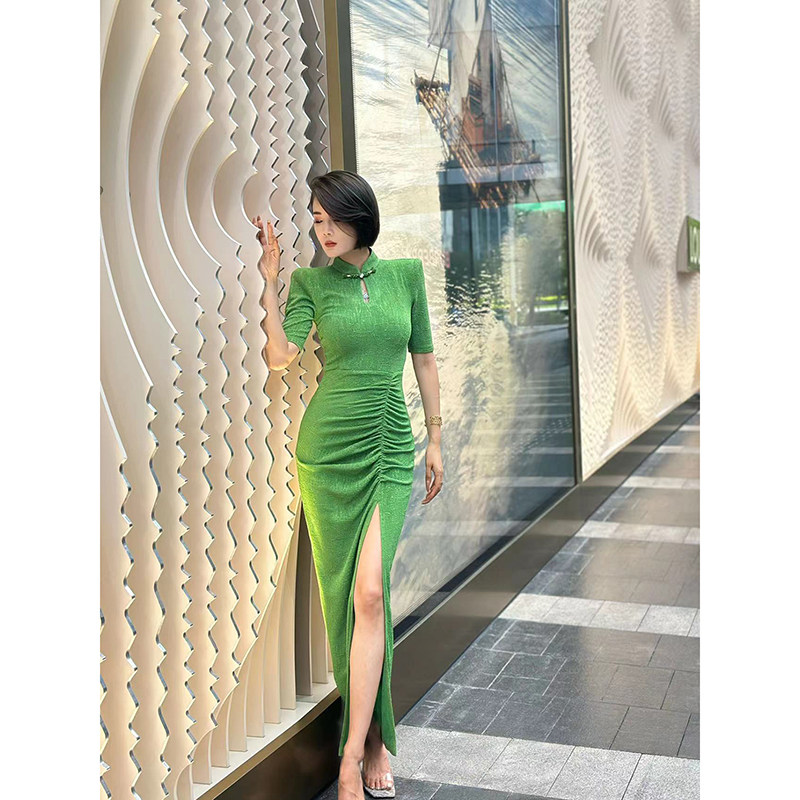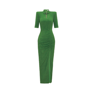 XULU原创复古肌理醋酸水滴领旗袍新中式 连衣裙 气质褶皱显瘦中长袖