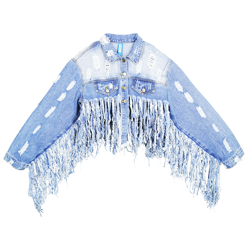 短外套宽松夹克上衣 翻领开衫 欧美风DJ演出破洞流苏长袖 复古牛仔衫