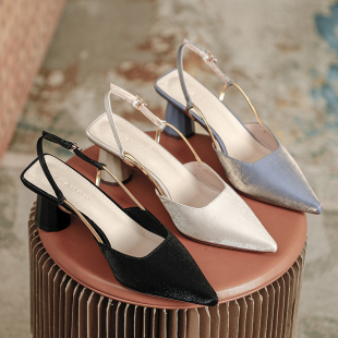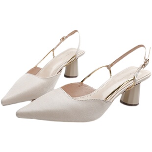 尖头气质淑女粗跟后空高跟单鞋 真皮包头凉鞋 女仙女风2021新款