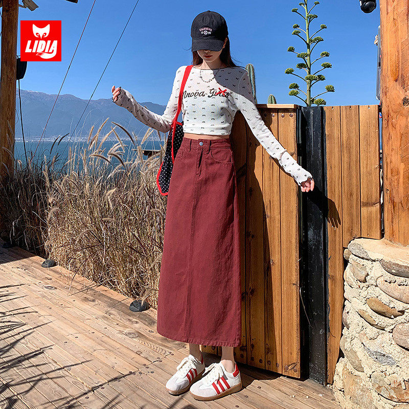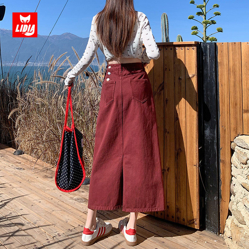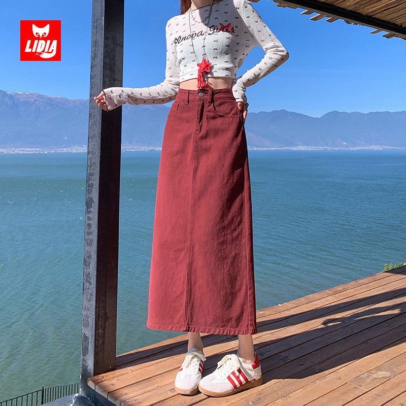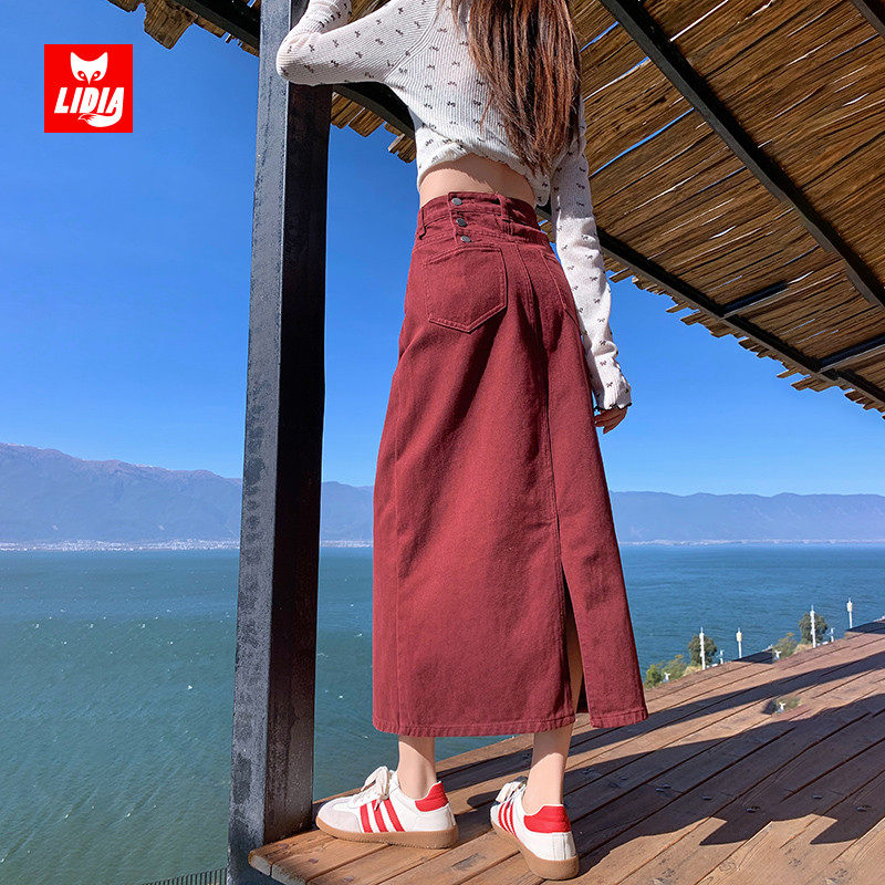 安可拉红牛仔半身裙女2025秋冬新款 复古开叉包臀裙 高腰a字中长款