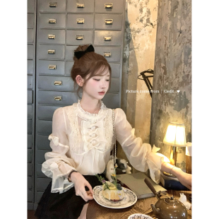 木耳边蕾丝花边蝴蝶结香槟色天丝麻衬衫 ss人偶心跳 女 迟伞伞