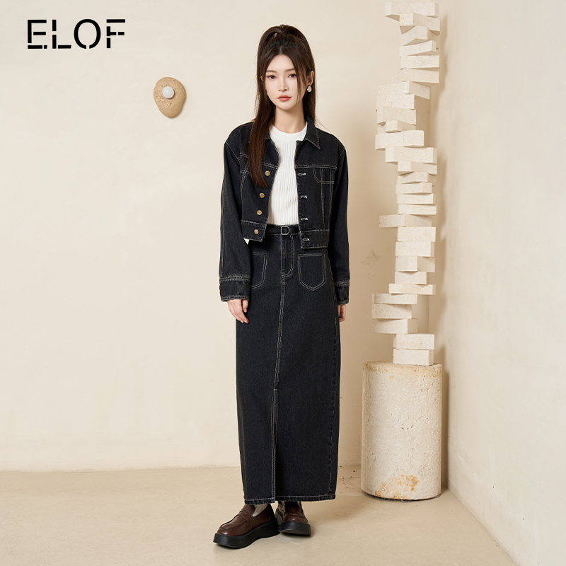 ELOF牛仔外套女复古短款 小众通勤半裙套装