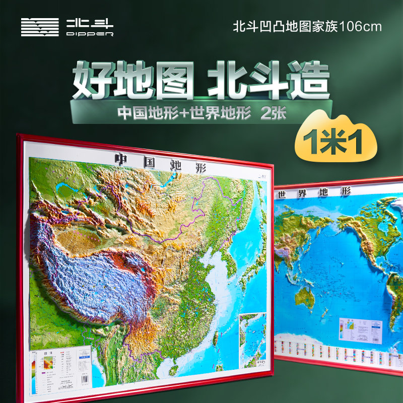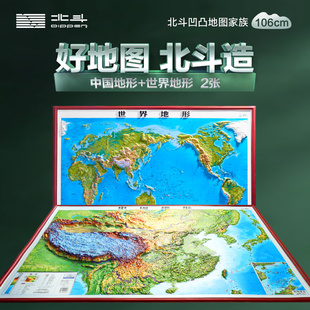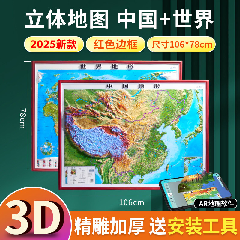 红色边框 大尺寸约1.1x0.8米北斗地形挂图办公室家用客厅挂画墙面装 2025新版 地图3d立体凹凸地形图 饰墙贴防水学生用 世界和