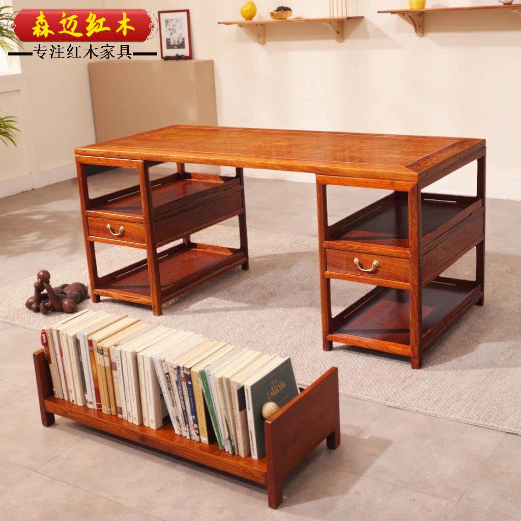 红木书桌进口菠萝格书架组合电脑桌打蜡全实木写字台办公桌1.3米