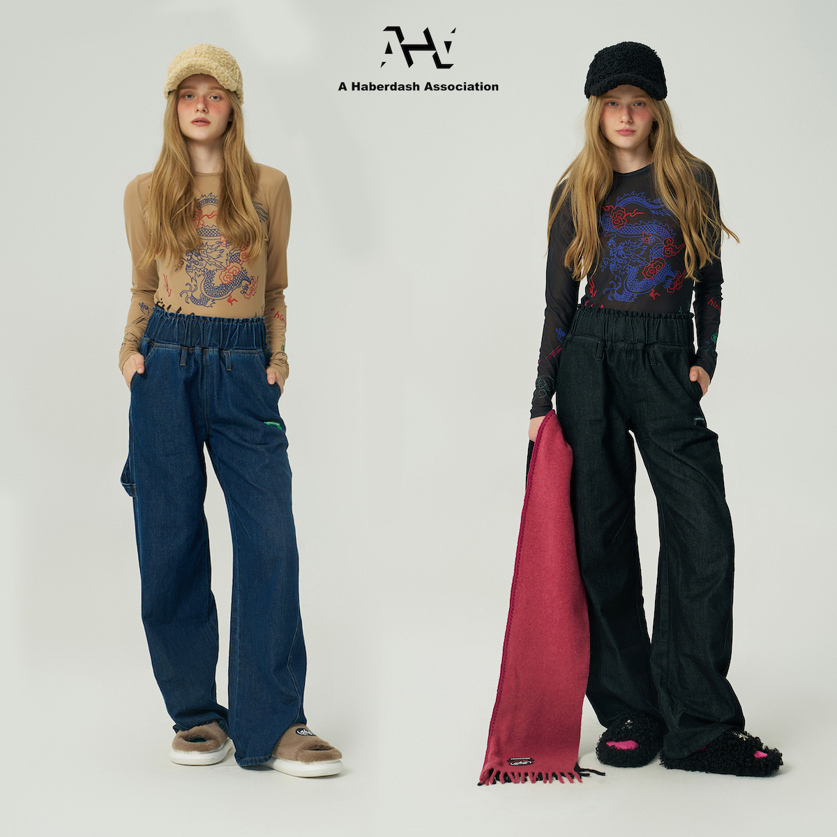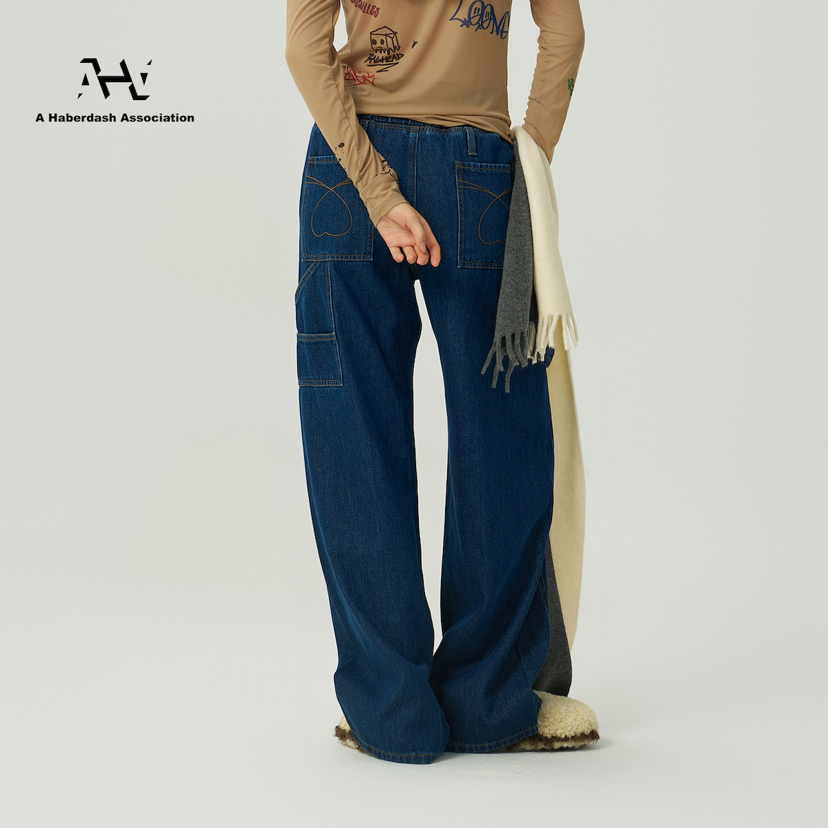 情侣洗水廓形牛仔长裤 AHA爱侈艾·休闲街头松紧腰工装 TNT同款