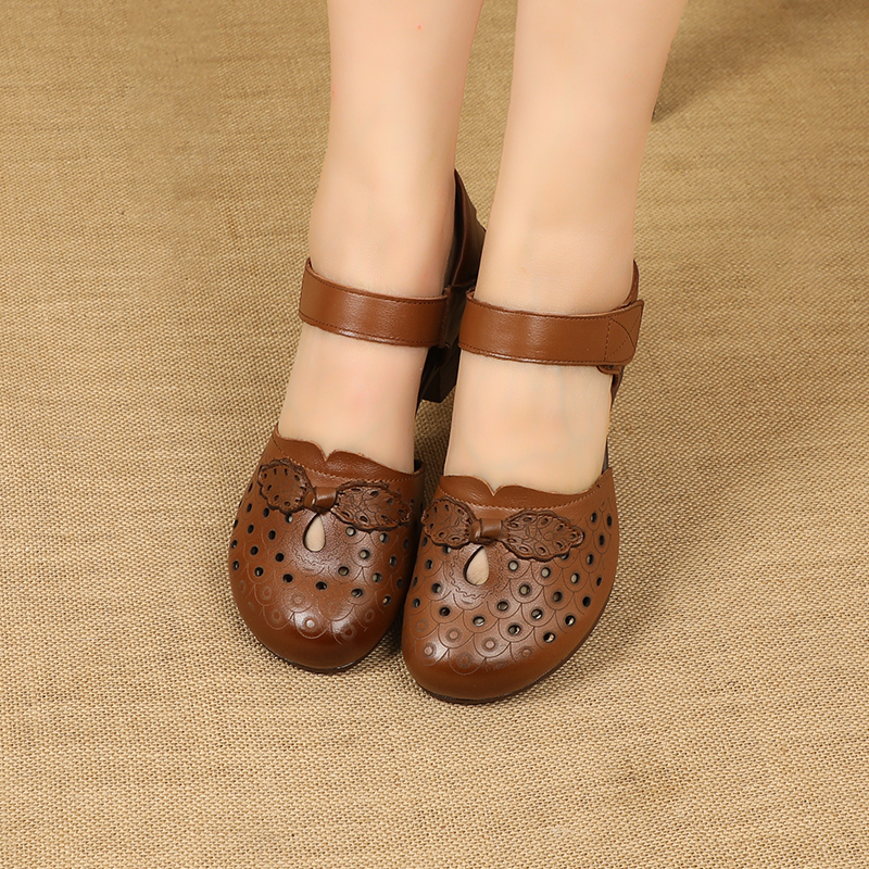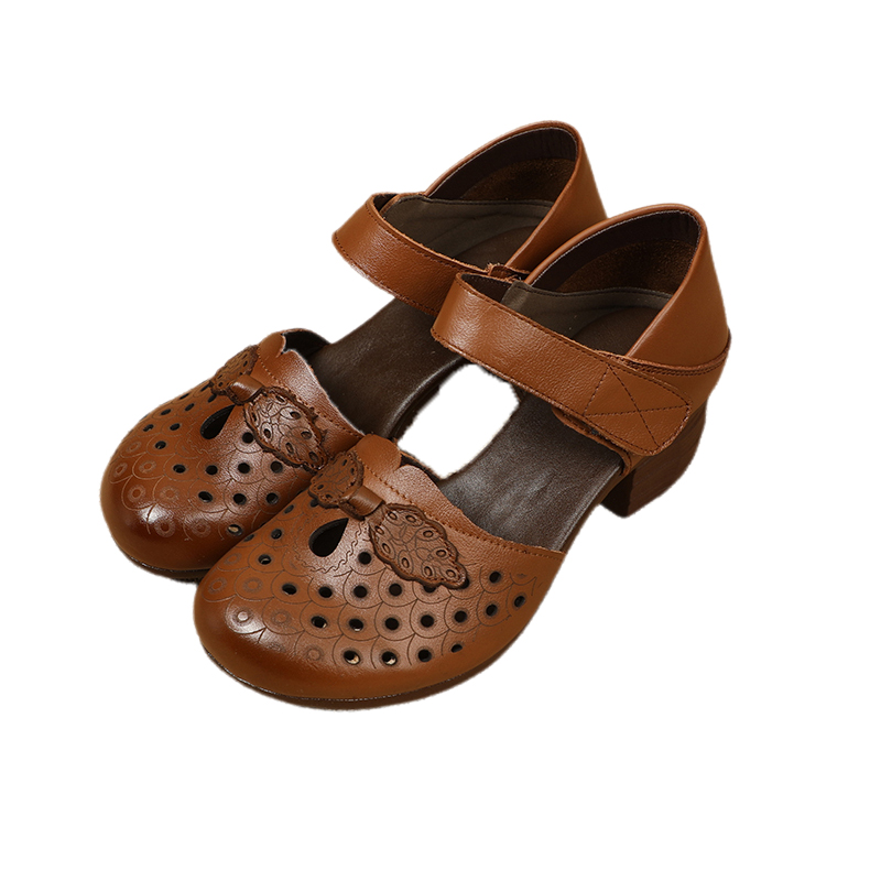 舒适中跟防滑包头镂空洞洞中老年皮鞋 真皮凉鞋 新款 民族风女鞋 夏季