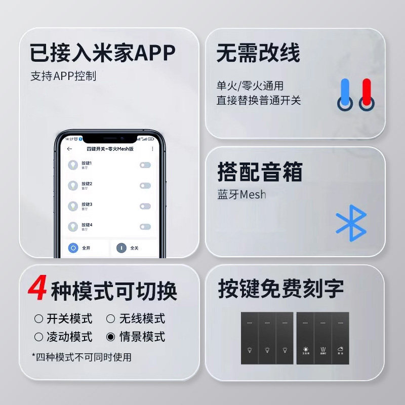 ahorro奥能已接入米家APP智能开关四开双控蓝牙mesh2.0单零火版