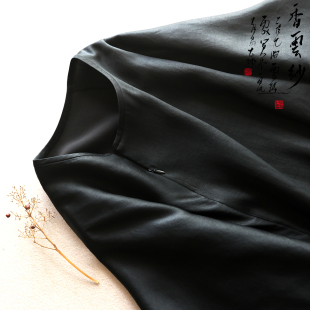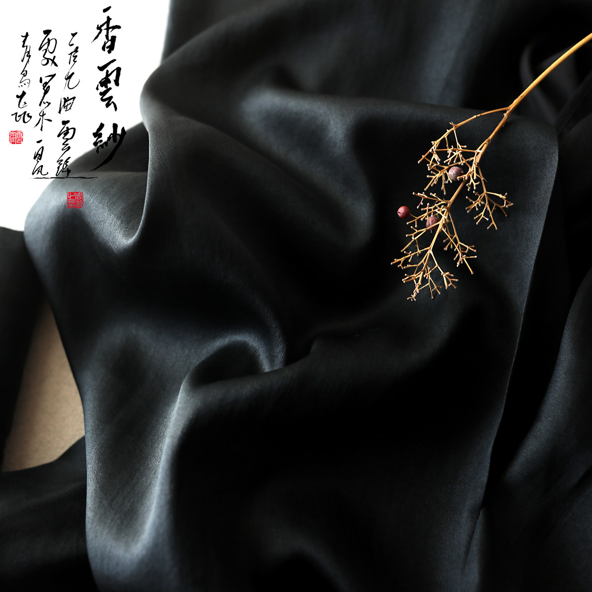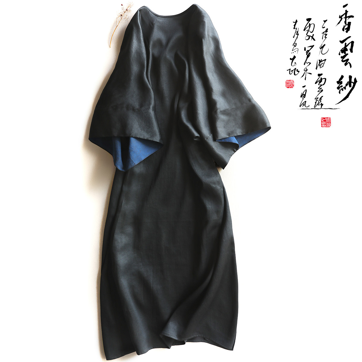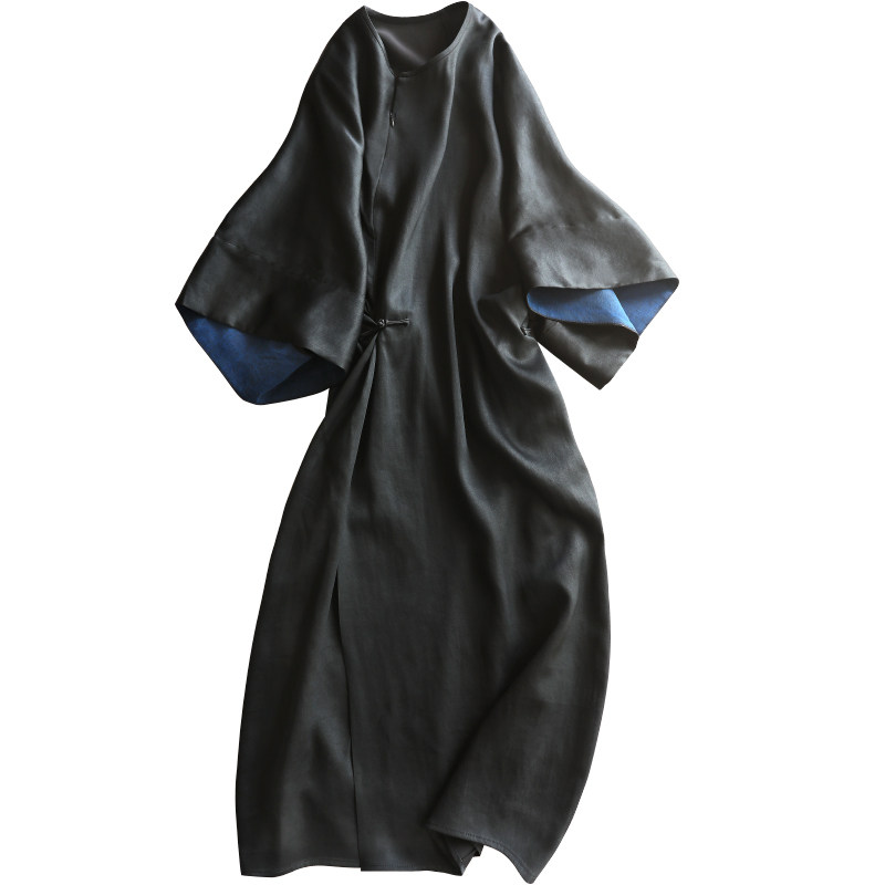 云澍原创 连衣裙早春盘扣桑蚕丝长裙 黑色素绉缎香云纱宽松倒大袖