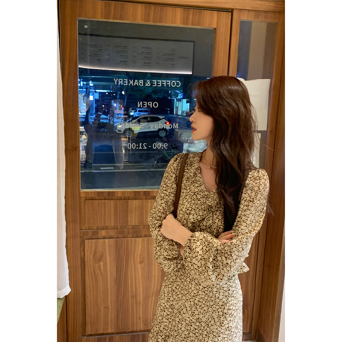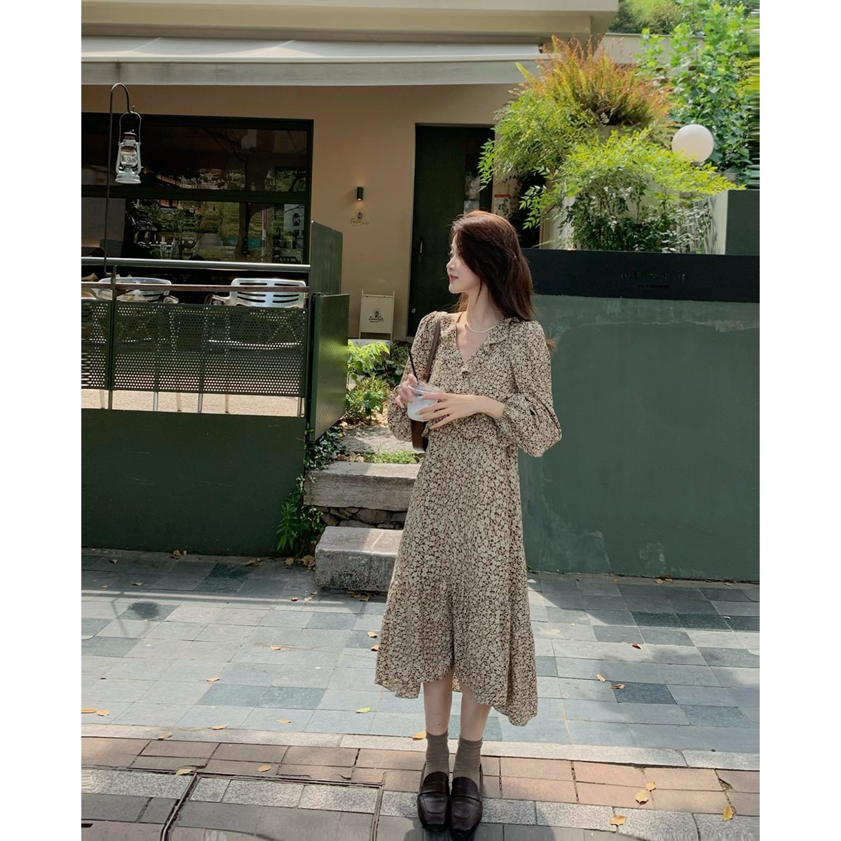 霍里德地图 蝴蝶结U领丝绒连衣裙女 复古千金感压褶层次泡泡袖