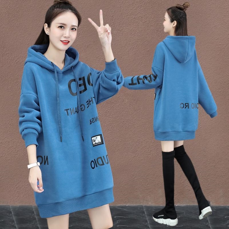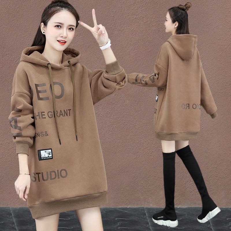 大码 加绒高个子加长版 宽松显瘦胖mm连帽 遮屁股卫衣女秋冬季 中长款