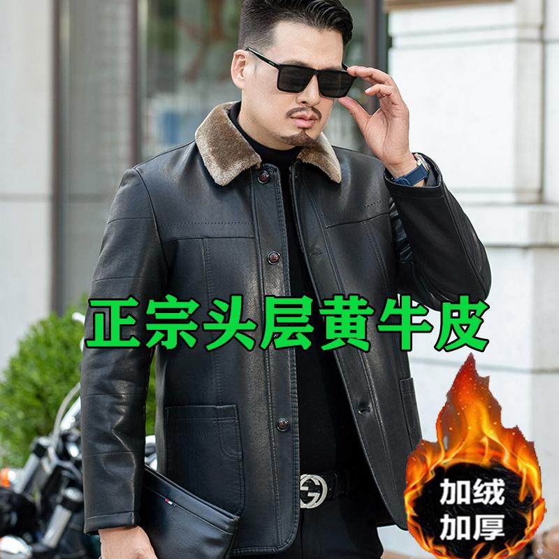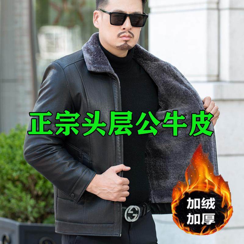 中年爸爸装 加绒外套绵羊皮翻领夹克衫 海宁真皮皮衣男秋冬新款 正品