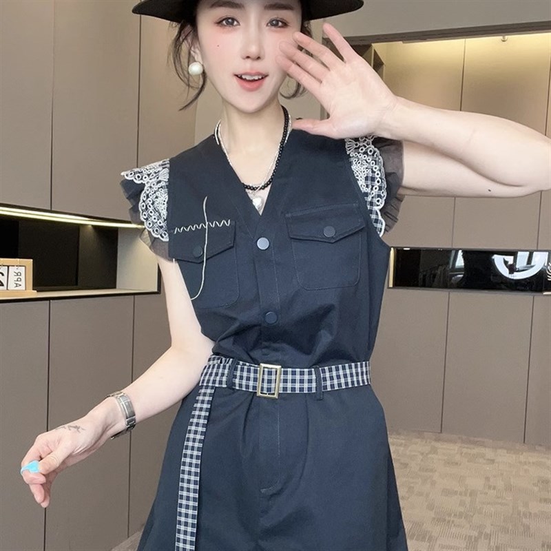 V领格子腰带收腰裤 连体短裤 纯色蕾丝拼接连体裤 新款 子 女2025春季
