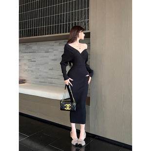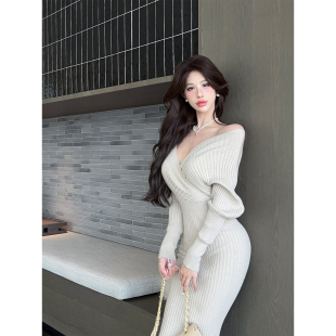 收腰长裙包臀裙长袖 法式 裙子 V领针织连衣裙女2025冬季 灰尘邓邓