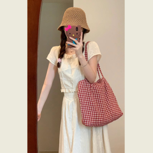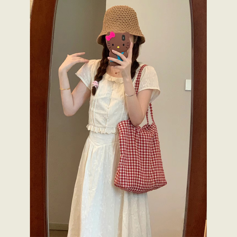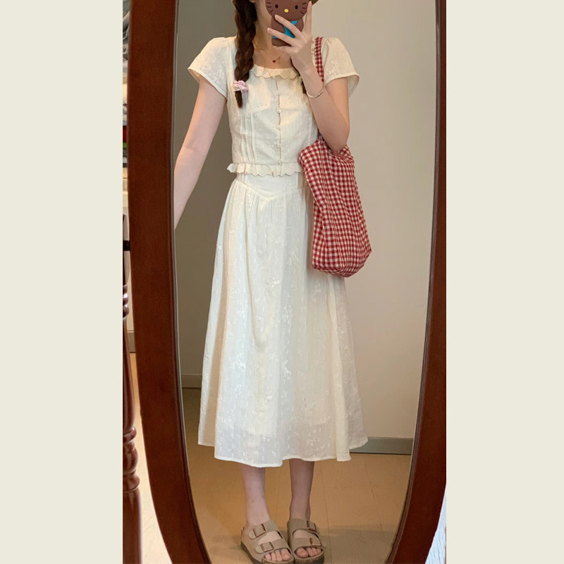 纯欲高腰半身裙连衣裙两件套 女夏季 复古高级感蕾丝花边短袖 衬衫