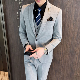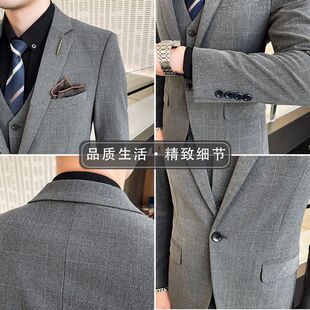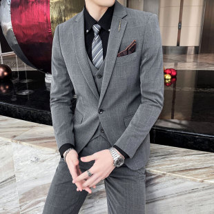 修身 男韩版 新郎伴郎婚礼礼服主持人格子西服三件套潮 套装 春秋西装
