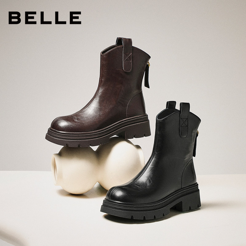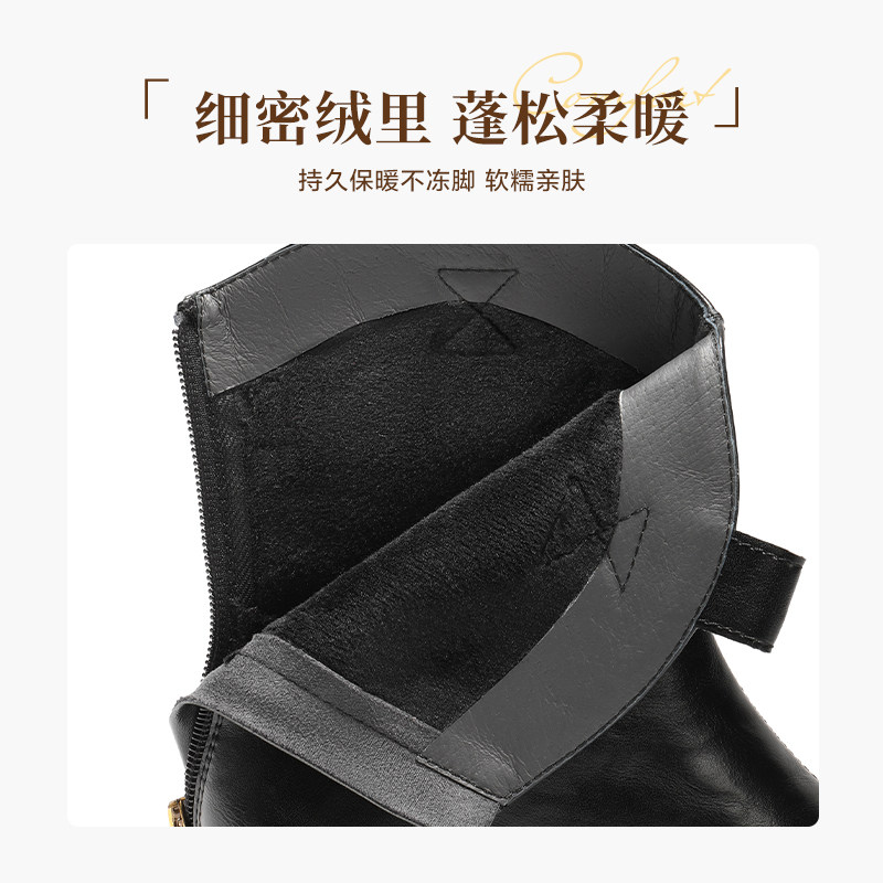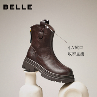 百丽复古加绒弹力靴女25冬季 厚底粗跟显瘦瘦靴短靴子E5E1DDZ5 新款