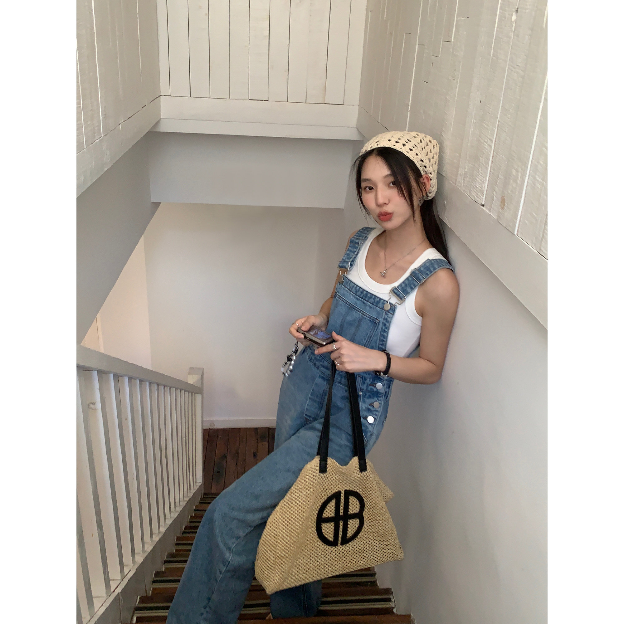连体裤 休闲显瘦直筒长裤 女宽松阔腿裤 pusumede蓝色减龄牛仔背带裤