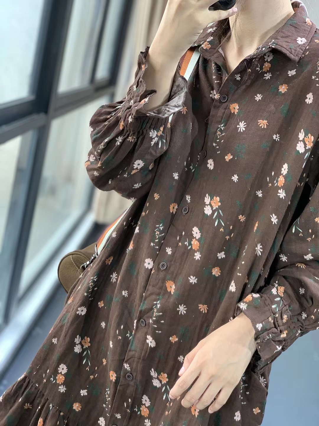 复古森系碎花褶皱荷叶边连衣裙女春秋文艺宽松休闲减龄开衫 中长裙