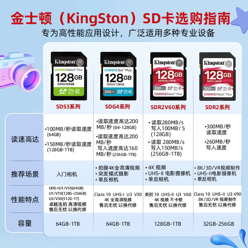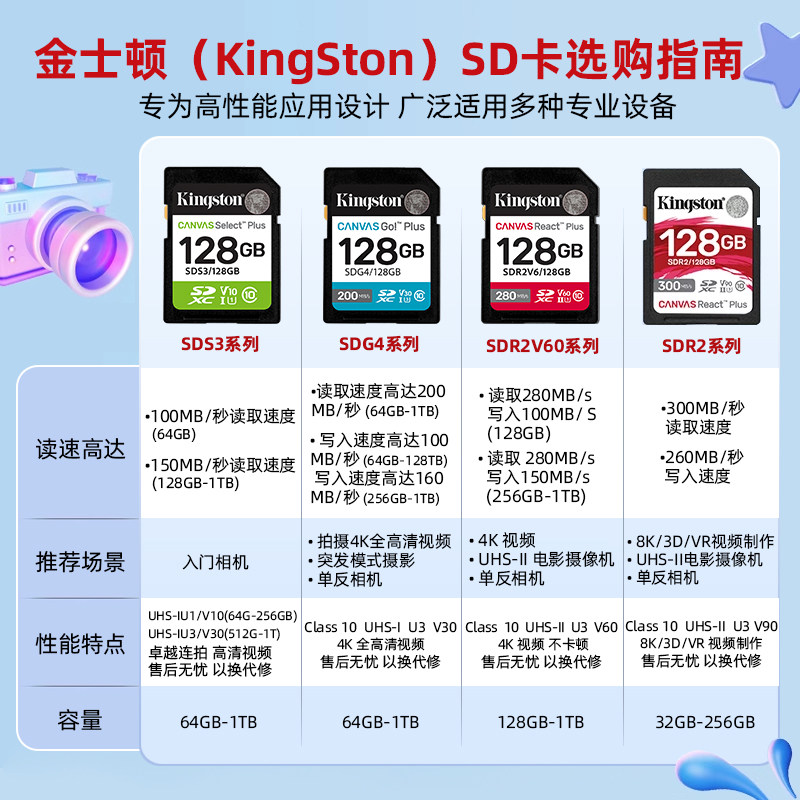 金士顿官方128G相机内存卡256g高清4K索尼佳能富士尼康通用卡sd卡