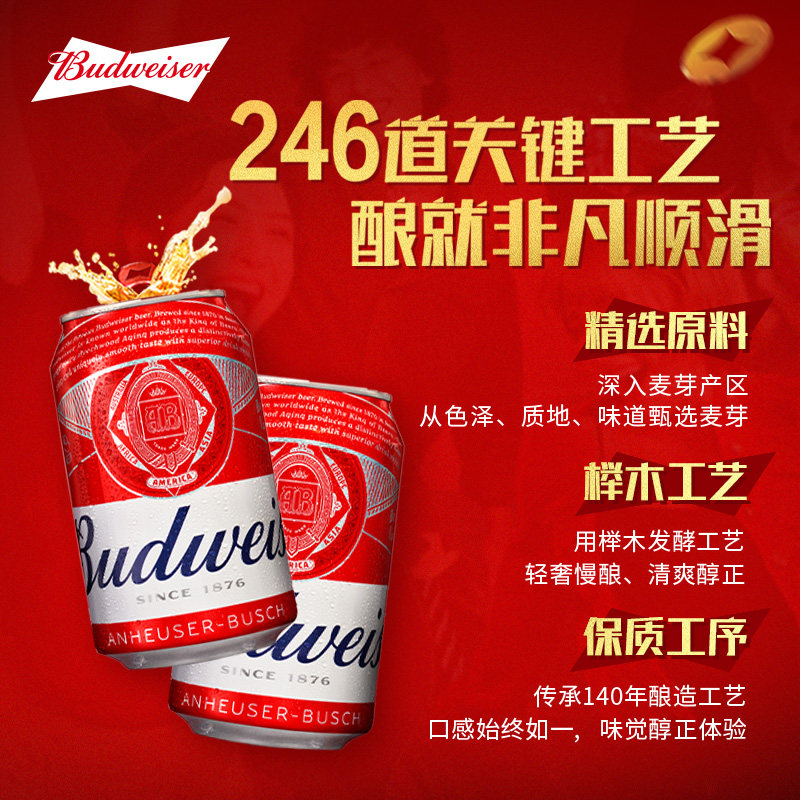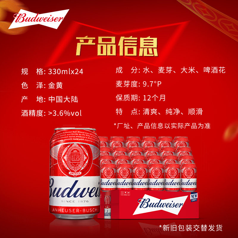 百威啤酒经典 24听9.7°P啤酒整箱批发24罐 醇正红罐拉格330ml