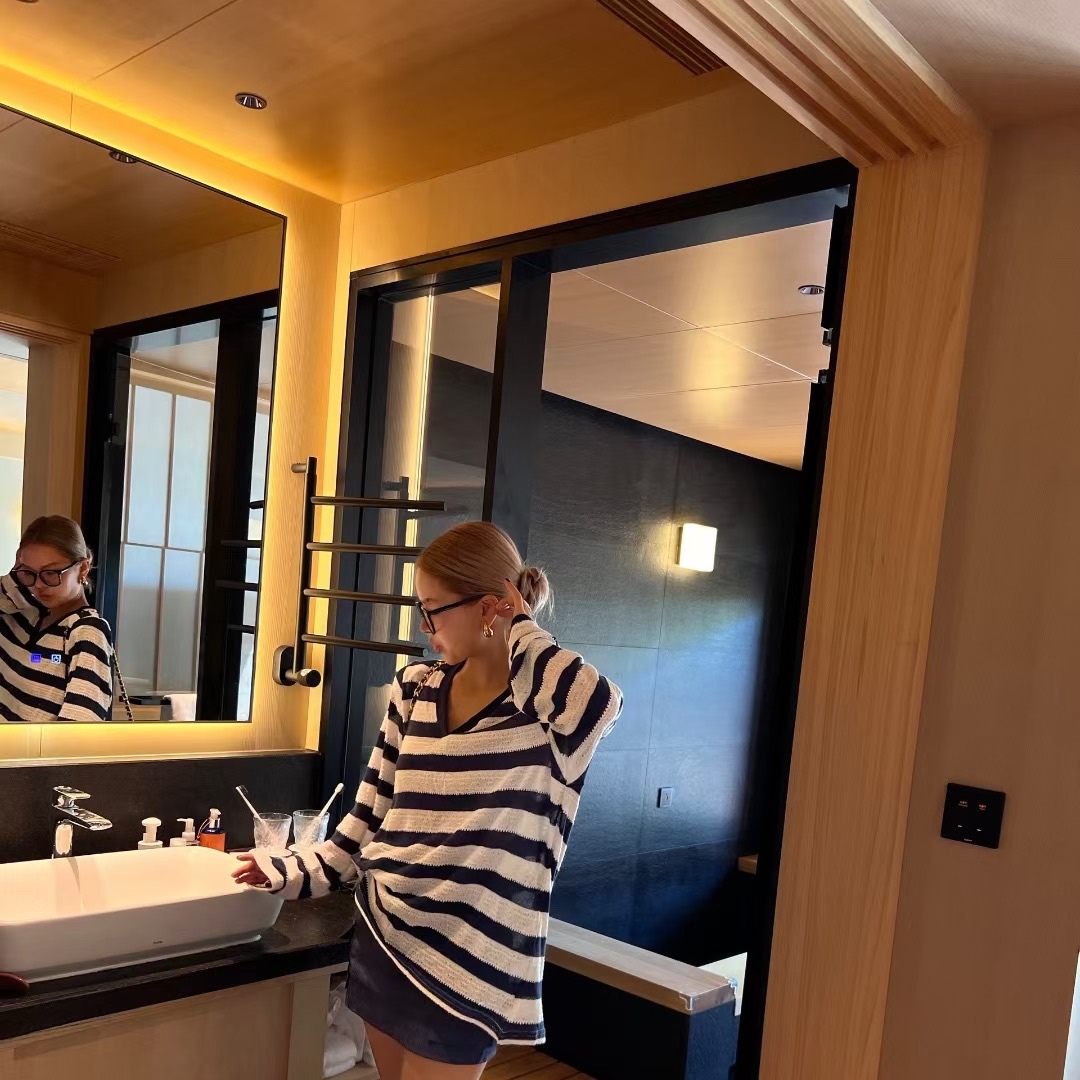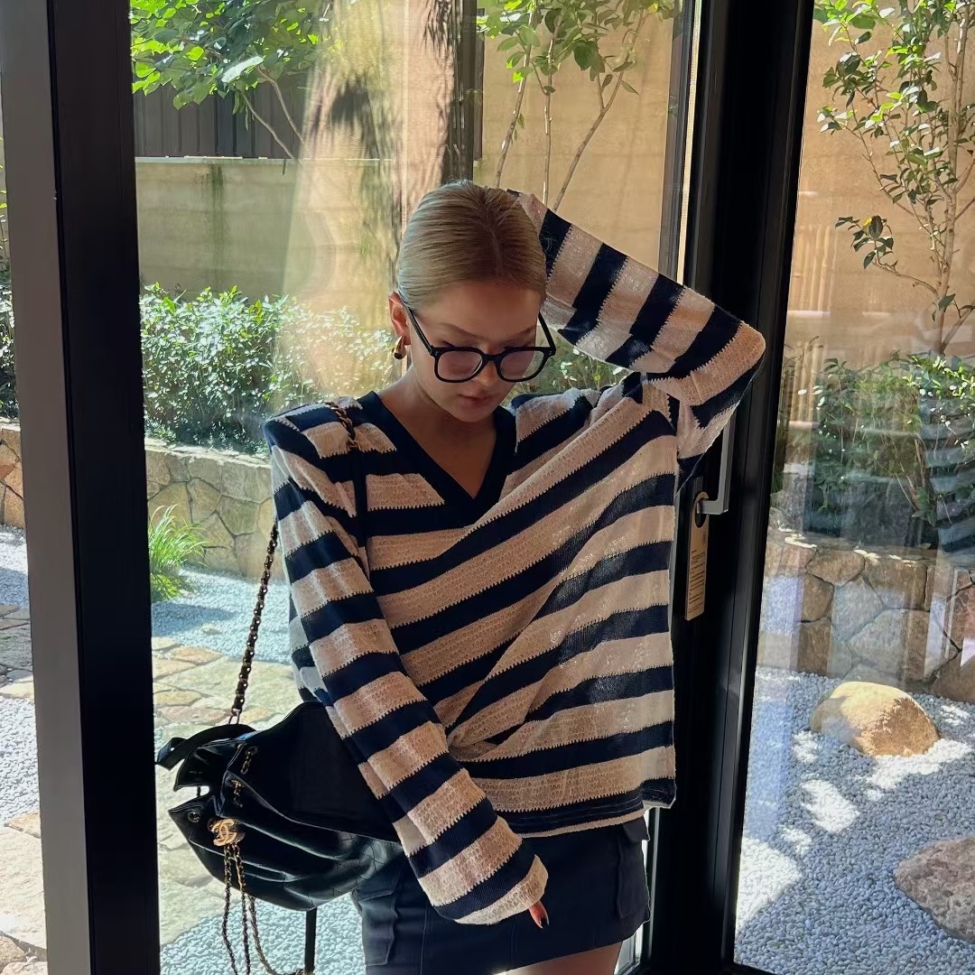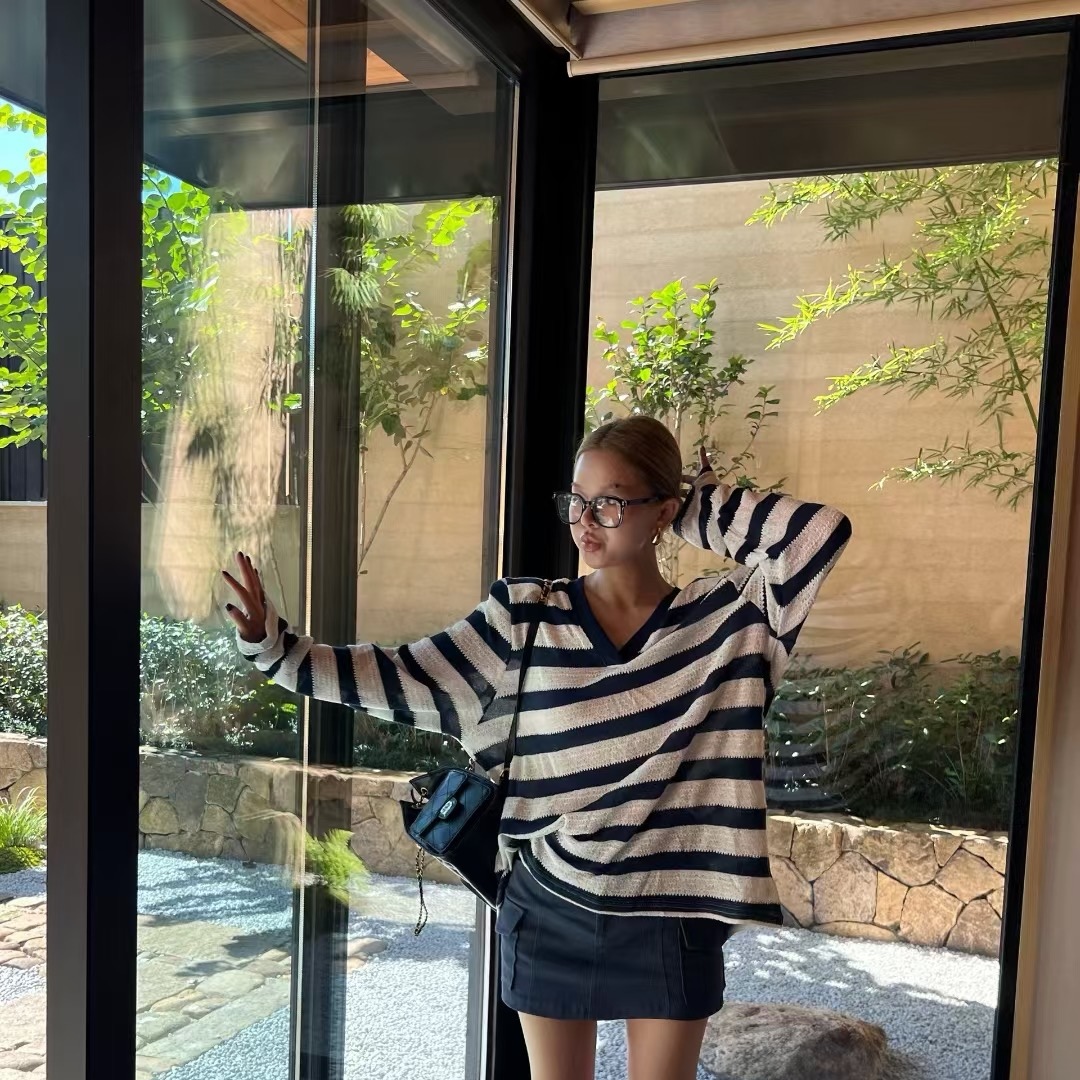 T恤女 显瘦藏蓝色V领条纹宽松垫肩长袖 韩国代购 2025早秋新款