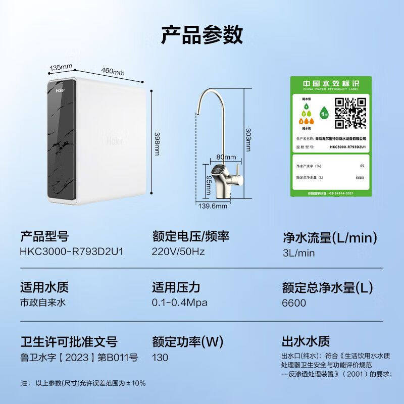 海尔净水器1200G家用RO反渗透直饮鲜活水净水机HKC3000 R793D2U1