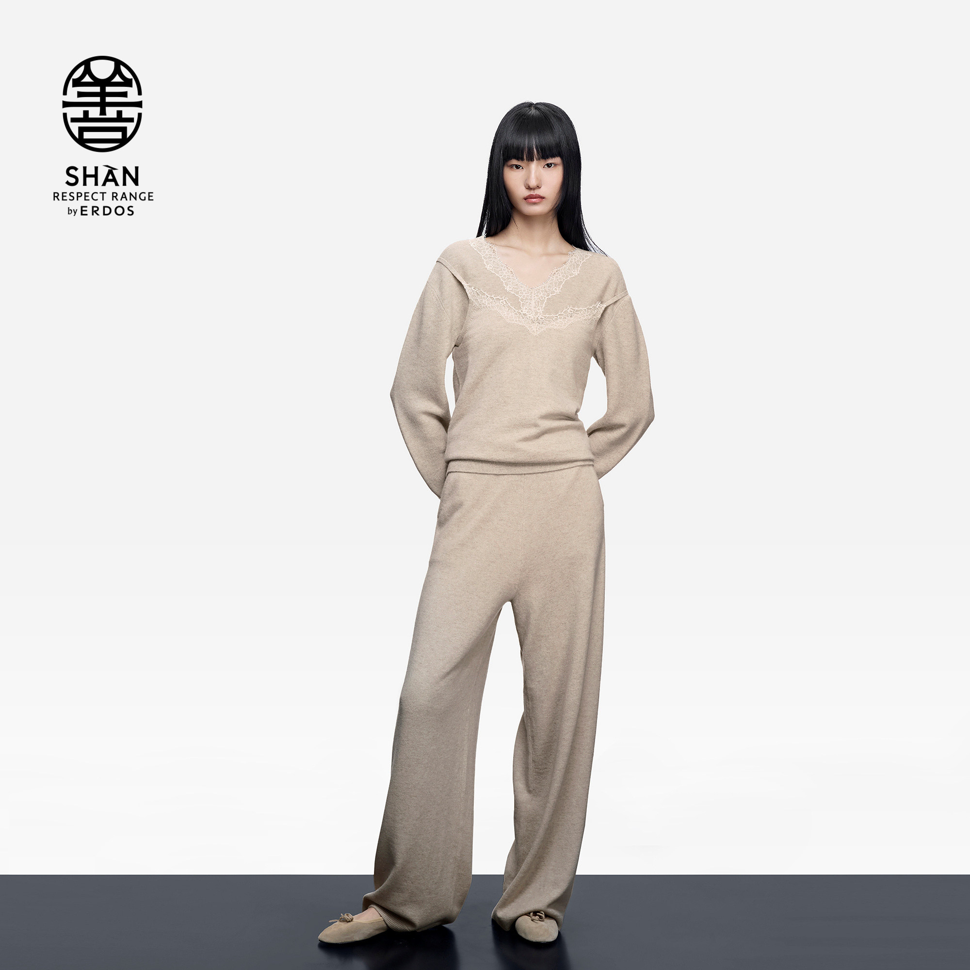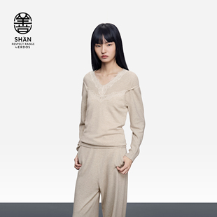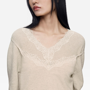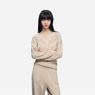 女士V领羊绒衫 通勤长袖 25年秋冬新品 饰翻花套衫 内搭 蕾丝装 ERDOS