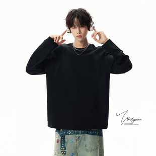潮牌拼接廓形正肩T恤宽松长袖 男春季 卫衣 半高领白色打底衫 V37美式