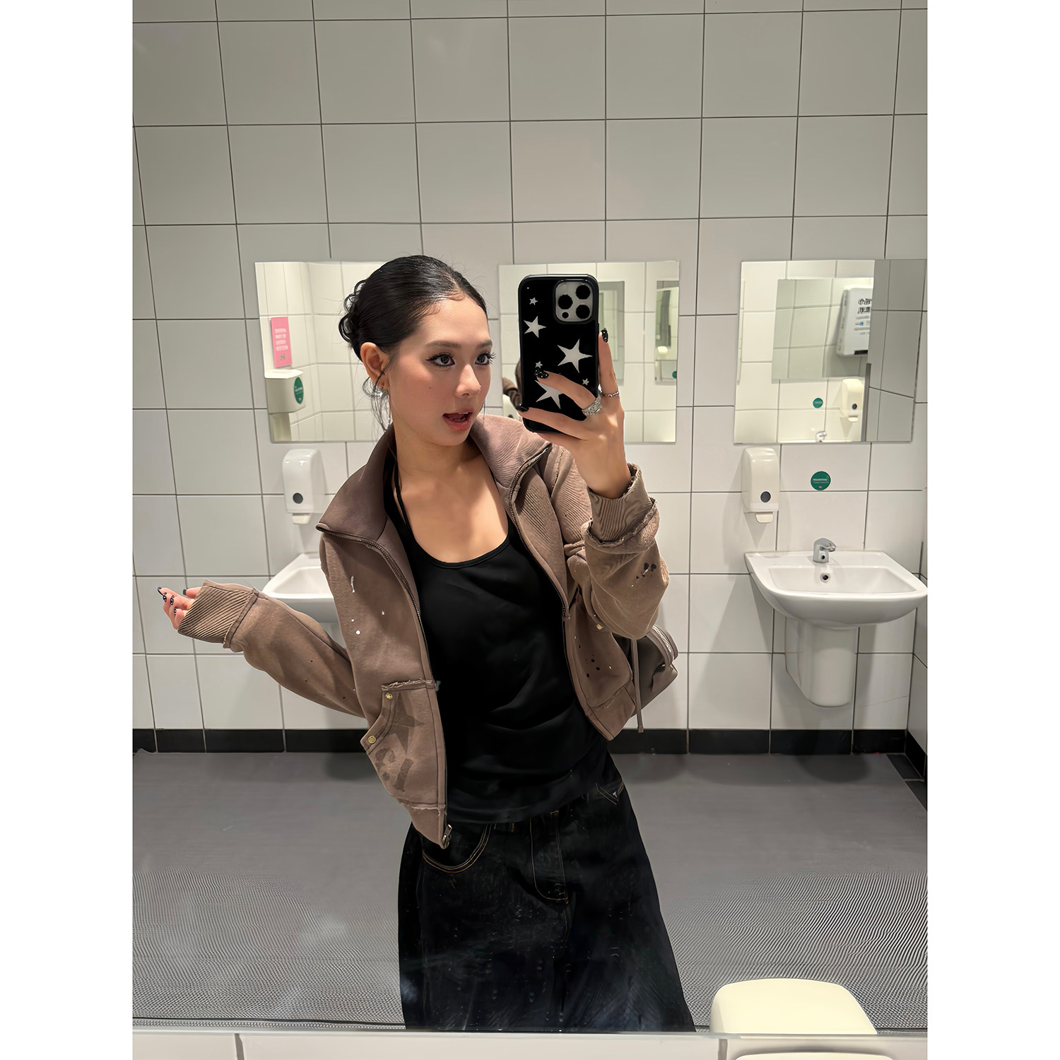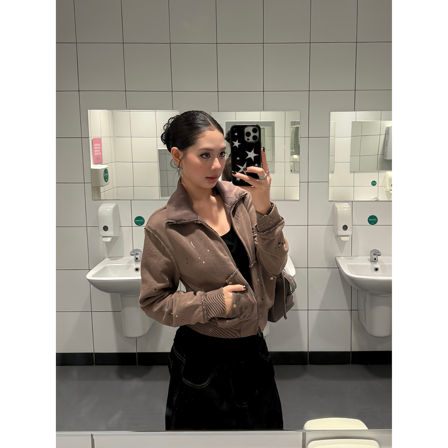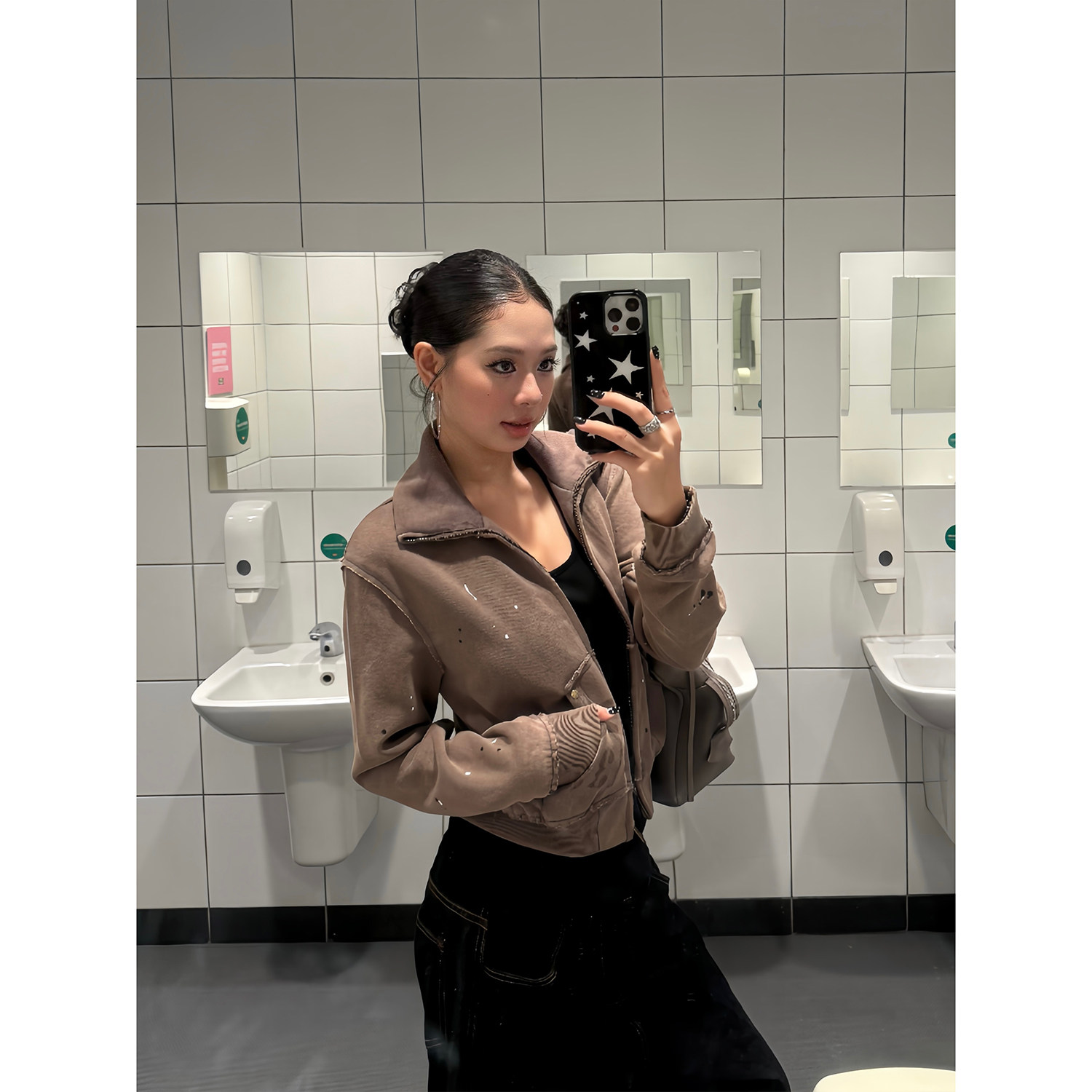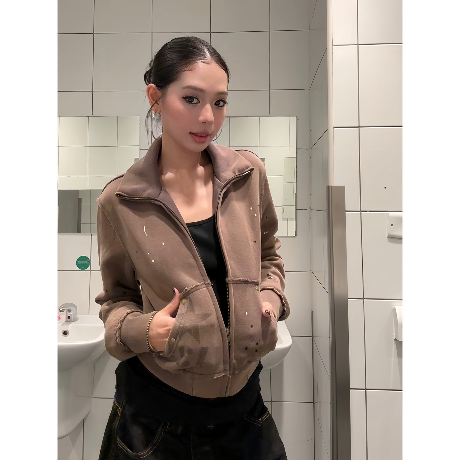 外套女秋季 复古铆钉做旧泼墨辣妹立领短款 休闲短上衣潮 美式 F383