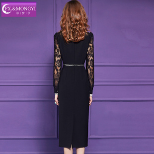 别致时尚 秋季 高级感职业中长裙 连衣裙女长袖 菲梦伊蕾丝边黑色西装